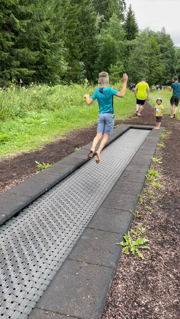 Luckily, we got parking right by the entrance, we stripped our shoes and headed out on the walk. It started out so easy with a walk through grass, crossing a few streams. There were lots of “challenges” to climb over and jump on. We carried on and the trail led us into the woods. The terrain of the trail changed periodically from mulch, to sticks, to sand, to mud, to dirt.