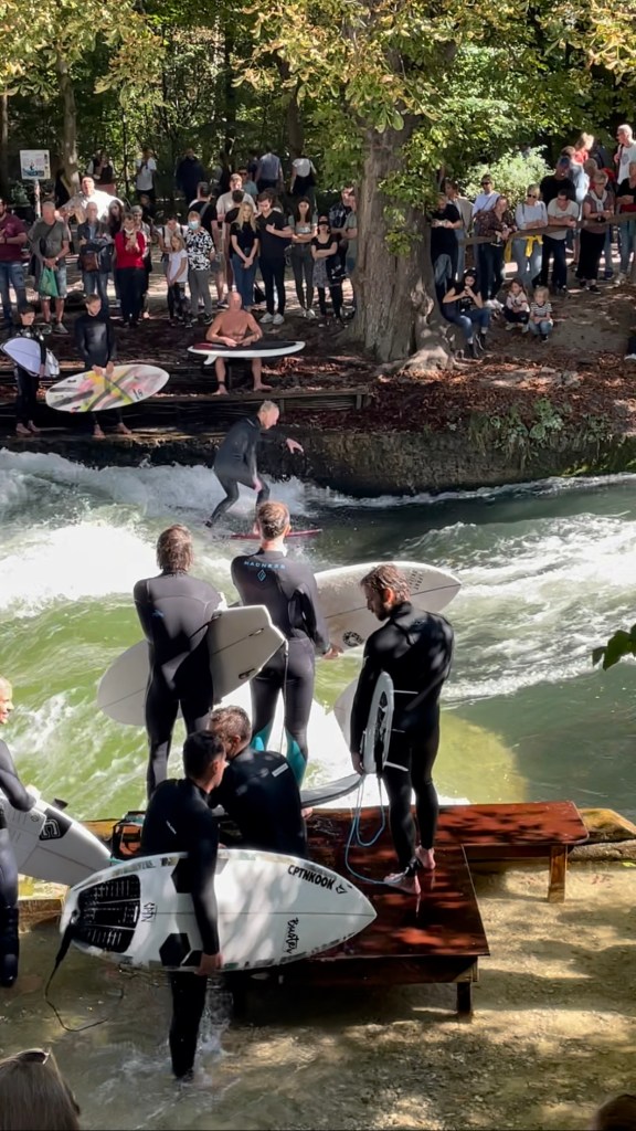 We walked and walked for ages. There are lakes and a canal that go through the park. We finally made it to our first intended destination, the wave on the Einsbach River. Because of the water rushing through at that point, there is a permanent wave that surfers take turns on. It was really cool, they definitely have quite an organized system of how to take turns and how long you can take. There were probably 30 surfers or more waiting and everyone went as though it was rehearsed.