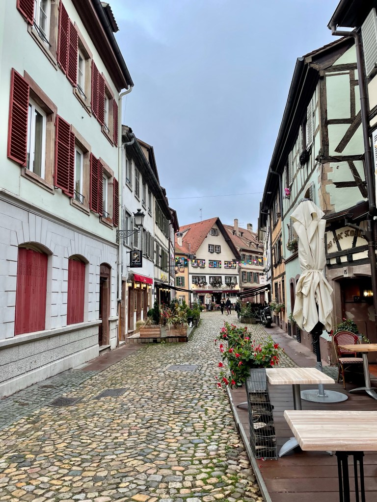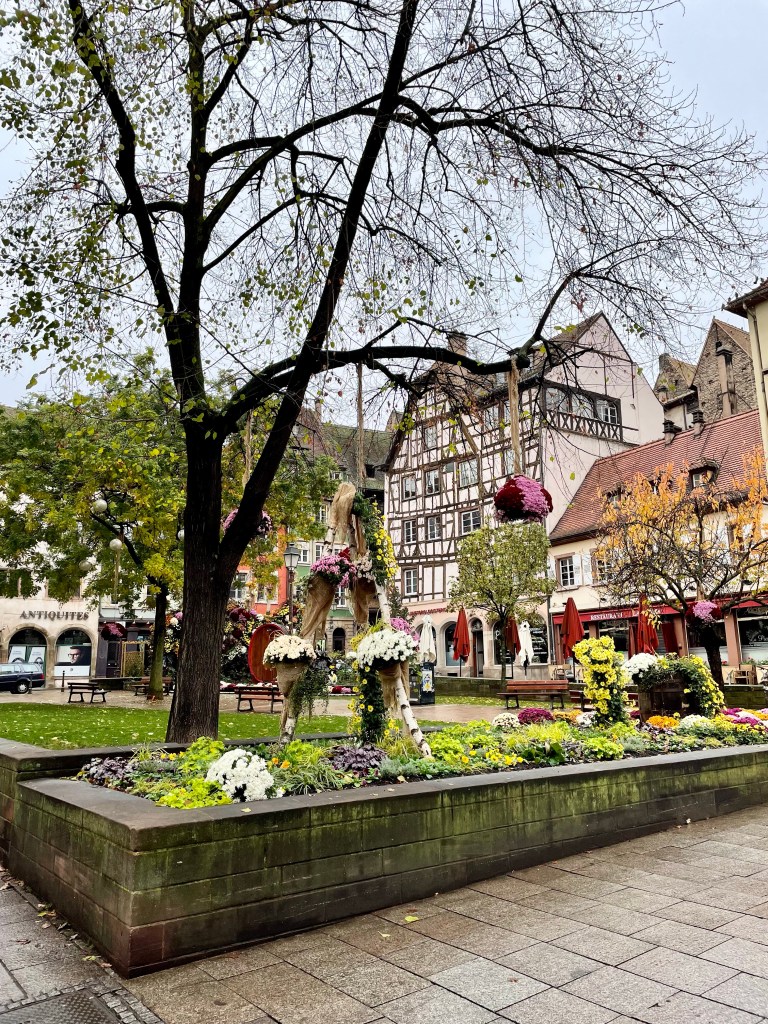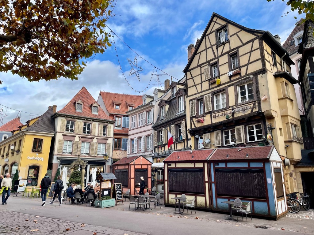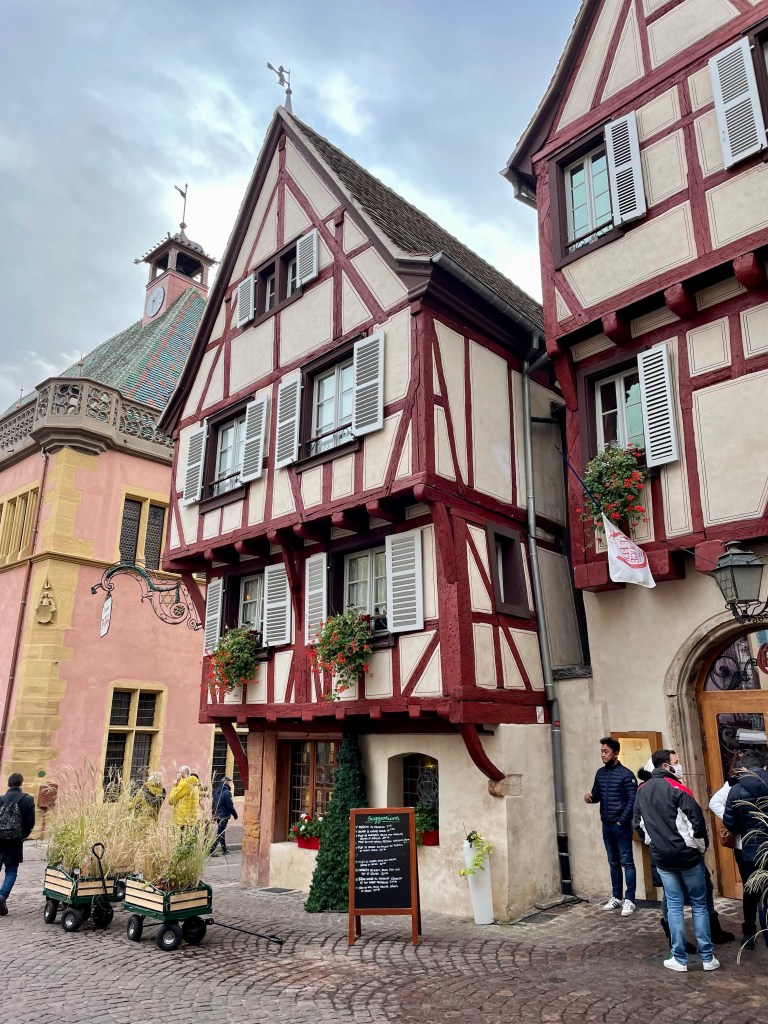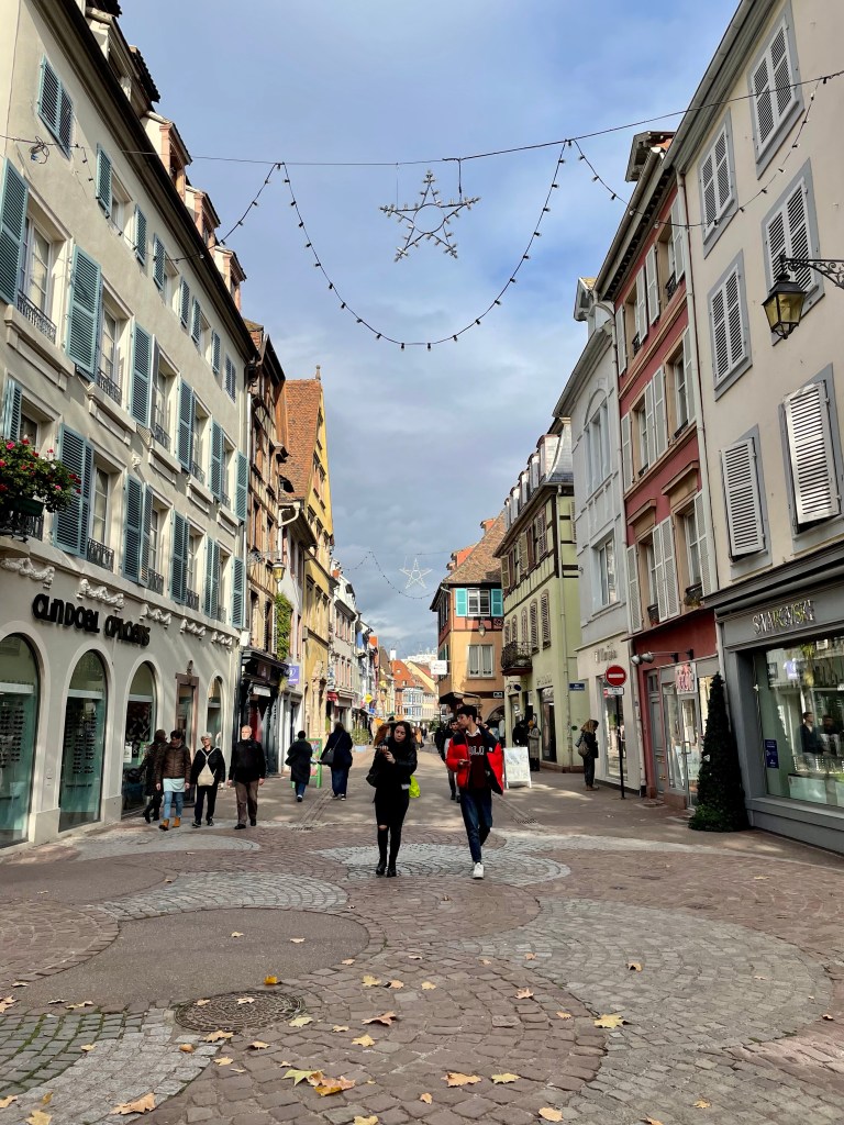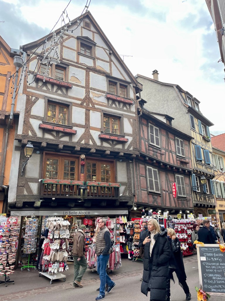 When we got up Saturday, the fog was gone thankfully. We drove about 45 minutes south to Colmar, a smaller, preserved medieval town. The town was getting ready for Christmas and decorations were everywhere. The Christmas Market stalls were set up for the market starting in a few weeks.