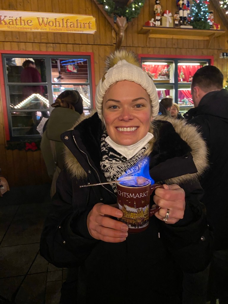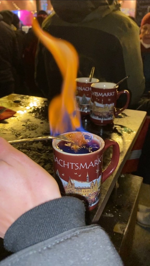 The drink is called Feuerzangenbowle, which means Fire Tongs Punch. It’s a mug of hot wine, and a special spoon is put across the top and a sugar cube placed on it. Then the sugar cube has rum poured over it and it is lit on fire. It tastes like super sweet wine with rum lol.