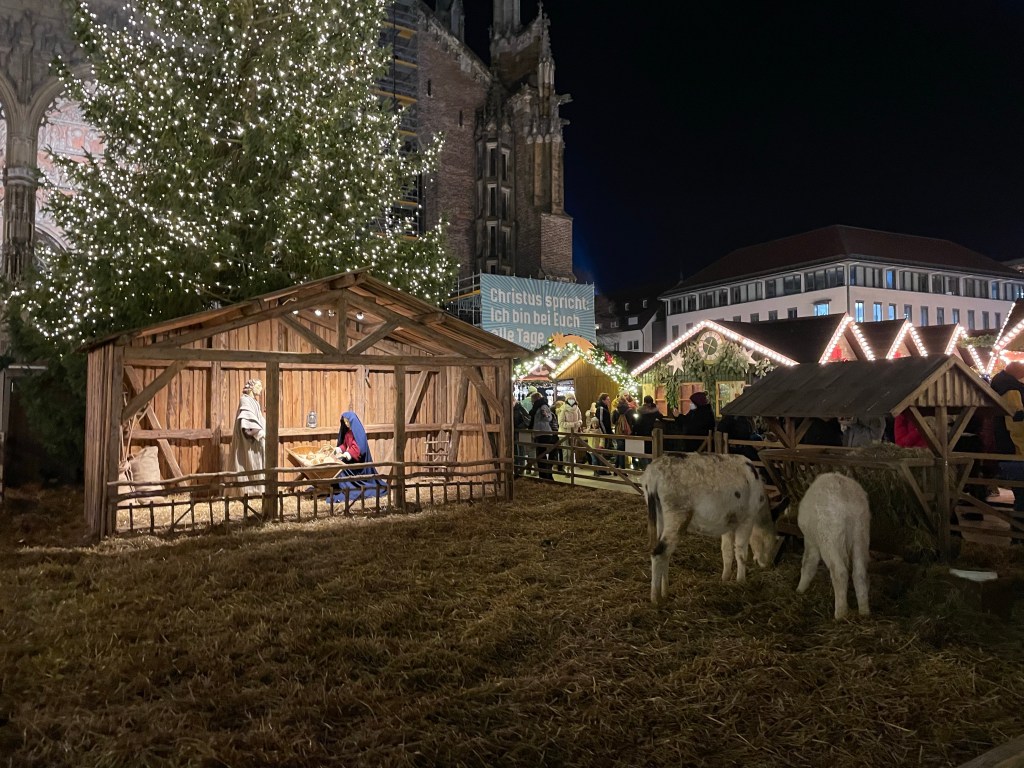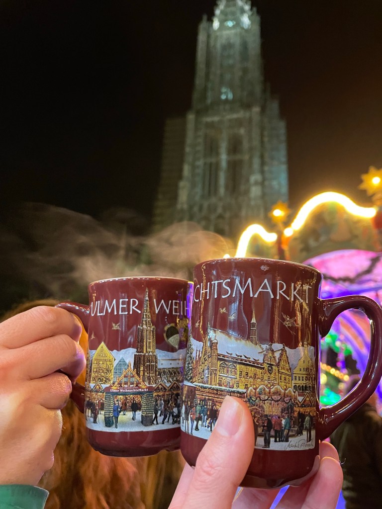 Ülm had one of prettiest markets I’ve been to so far. The market is set up in the square in front of Ulm’s beautiful church with its super tall steeple and there were lots of lights and trees, and even a nativity. There were plenty of food and drink options and lots of shopping. We got gluhwein as soon as we entered (of course) and grabbed some food for dinner. We noticed that the market had two different mugs so immediately determined we would need at least two gluhweins each in order to get both.