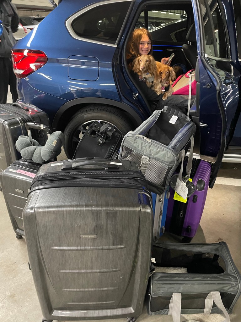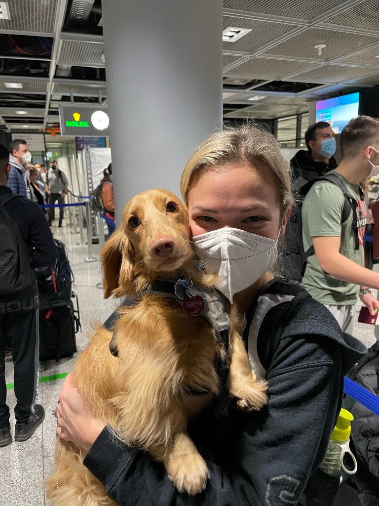 Saturday, we left the house at 5:30 and made the two hour drive to Frankfurt for our flight. The airport was a mad house but lots of people let us cut lines because we had the dogs. Everyone thought they were so sweet.
