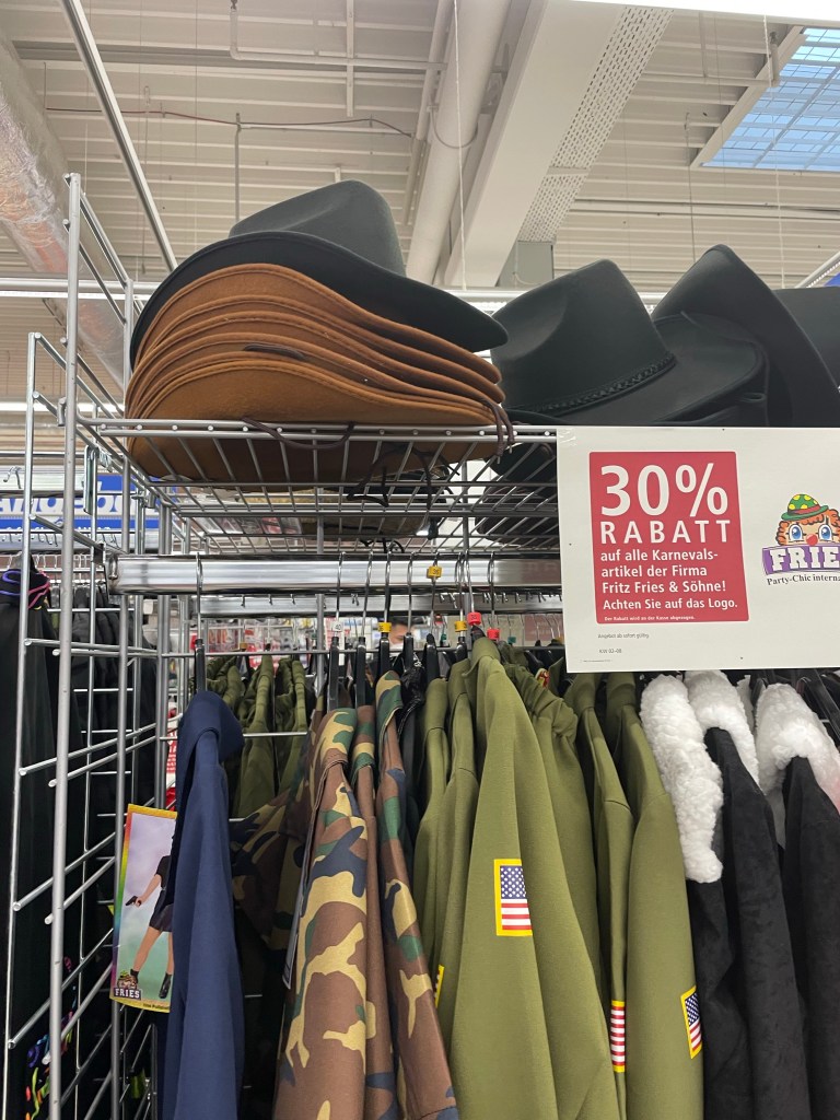 Afterwards, we headed back to Real to finish our shopping. Karneval, aka Mardi Gras, is coming up and this is the big costume holiday in Germany. I could not stop laughing at the American themed costumes: police, military, cowboys, and Indians. 🤣