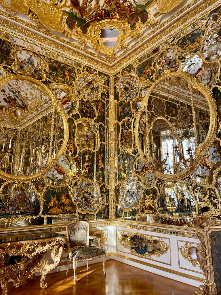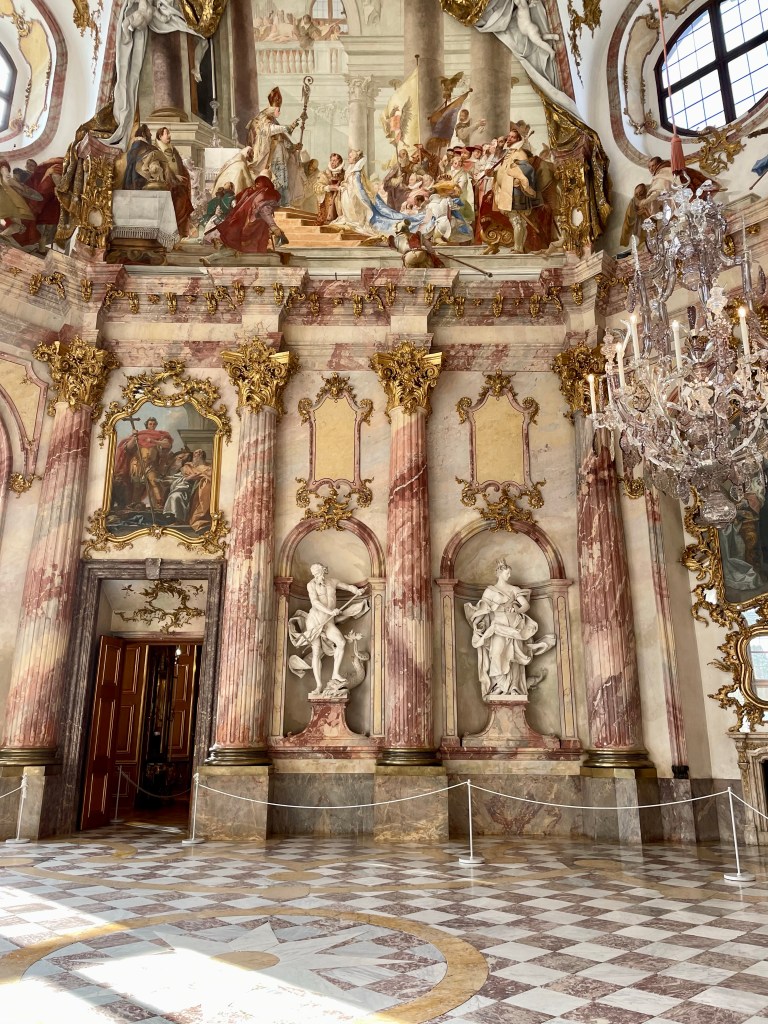 The inside, with its frescoes, carvings, gilding, and mirrors, was incredibly ornate. I would even say it was more ornately decorated and beautiful than the Palace of Versailles; just not as big.