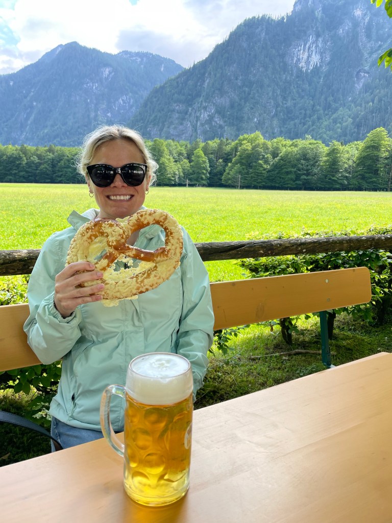 We got off, and had another bier and ice cream break. Matt and I shared the biggest cheese pretzel we’ve ever seen and Brooklyn got a cinnamon pretzel. Ryan ran around in the huge meadow behind the Biergarten.
