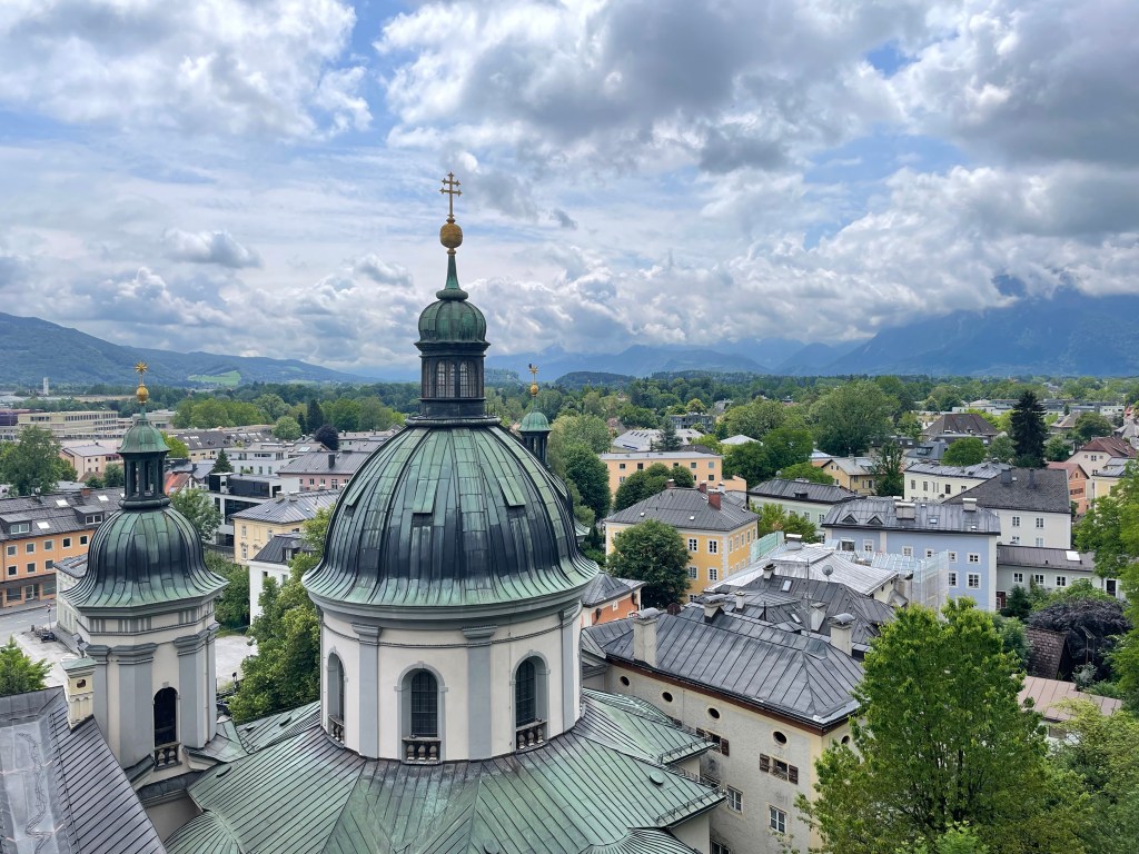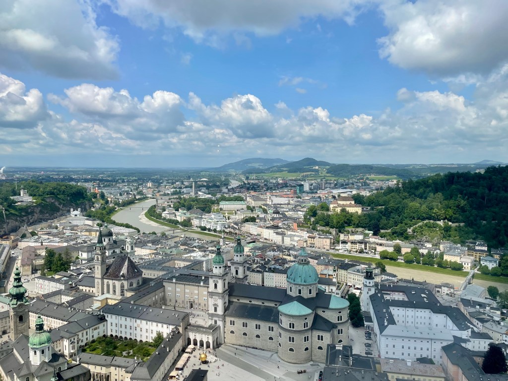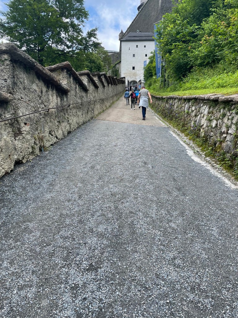 It was mid-day, so all the downtown parking garages were full and we had to drive a bit further out to find a parking lot. I mapped out a walk to the funicular that would take us up the mountain to the castle. Google Maps said it would be a 15 minute flat walk. We soon found out we were lied to 😂 and it was actually a super steep hike. To make it a little harder, when we got to the point to turn off for the funicular, we decided to walk the rest of the way up, thinking the top was near. Surprise- we weren’t actually even close and had an even steeper climb. We were so winded when we got to the gate, we could barely speak to the ticket agent in order to gain entry. To be honest though, we saw some of the best views of Salzburg, and got some amazing pictures.