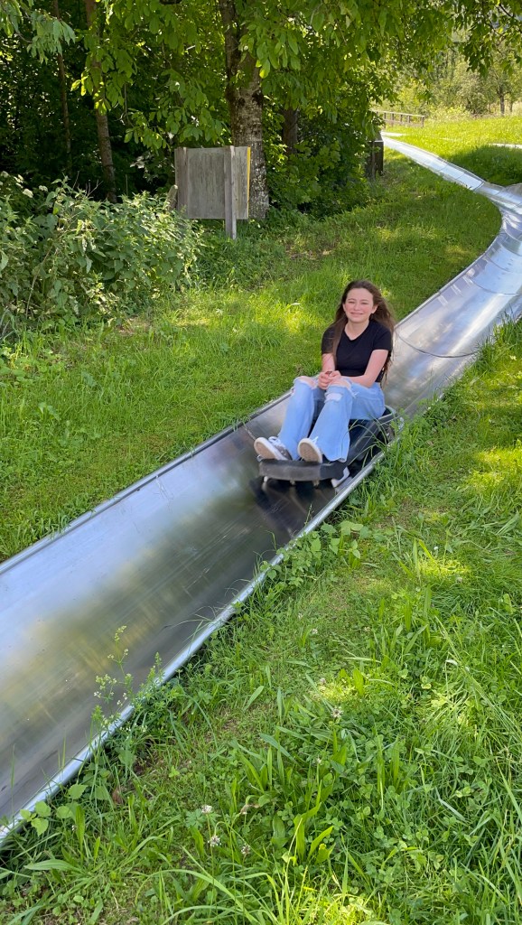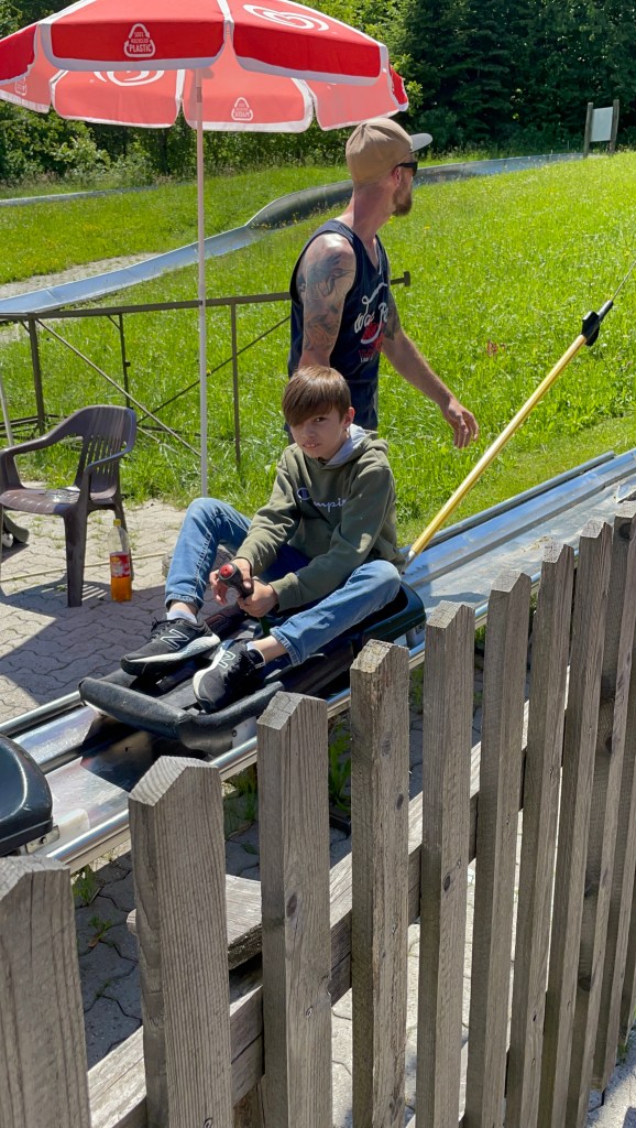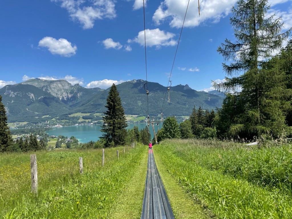 We had a quick breakfast and then drove to Wolfgangsee, or Lake Wolfgang, to ride the mountain coaster. There are quite a few in the are but I chose this one since it tows you up the mountain backwards, giving you time to look at the lake.
