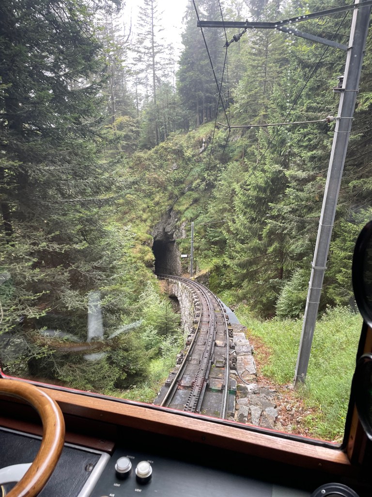 After about an hour long boat ride, we reached Alpnach, where we boarded the cogwheel train. There was no line for the train and the ride took about 45 minutes. It took us through forests, tunnels, and alpine meadows, complete with cows wearing their Swiss cowbells.