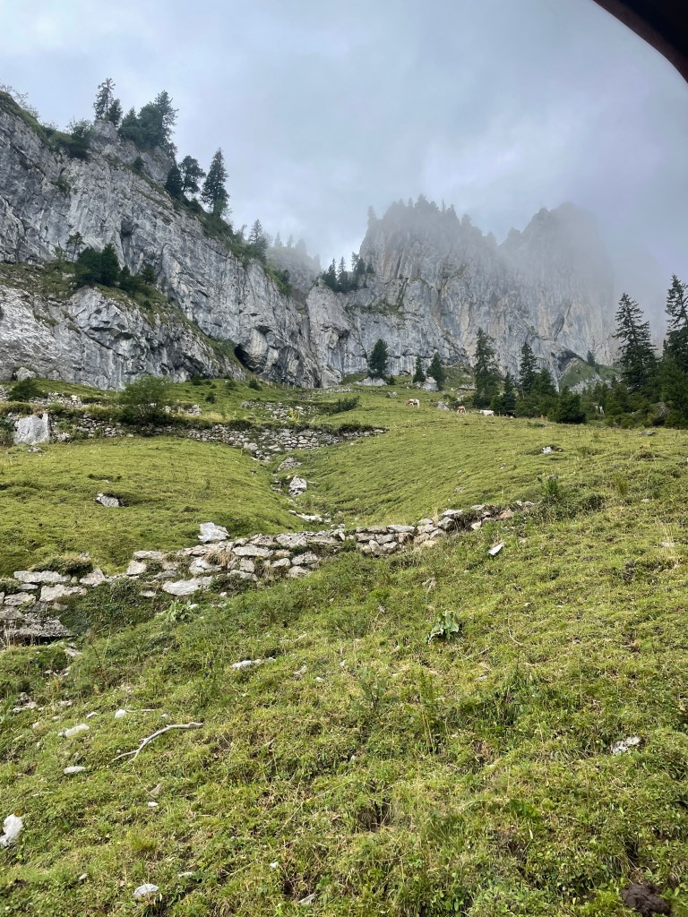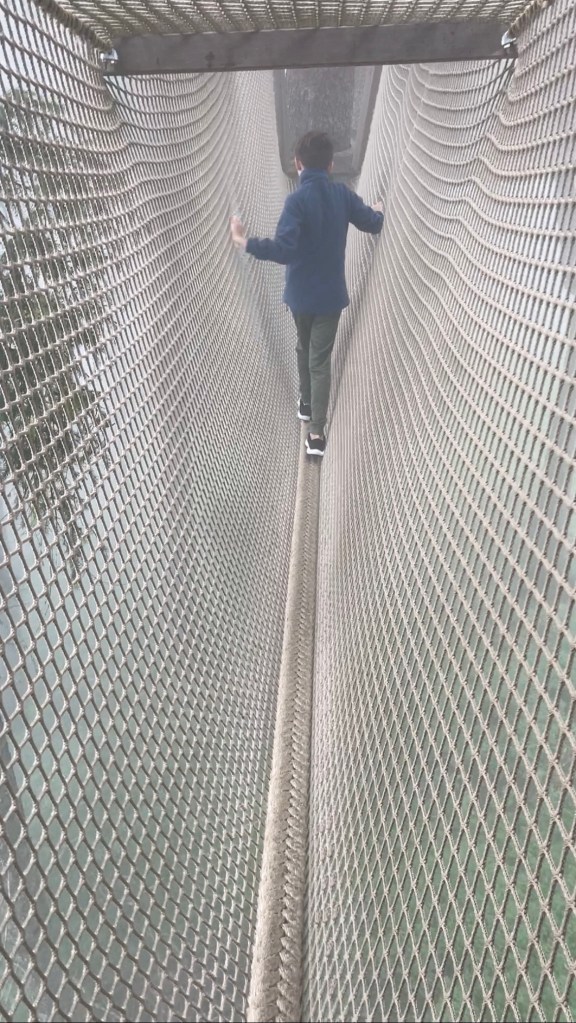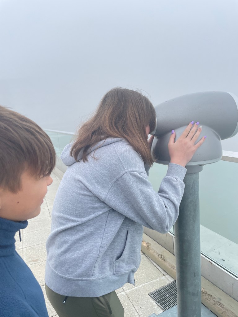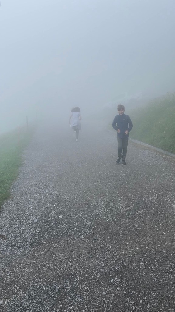 There are two different cable cars that take you back down Pilatus. The first stops at Fränkmüntegg, a tiny village on the way down. At this stop there is also a ropes course, mountain coaster, and treetops walk. The mountain coaster was closed due to fog but we did do the treetop walk while we were there. The kids had fun playing hike and seek in the fog. Then, it was on to the next cable car.
