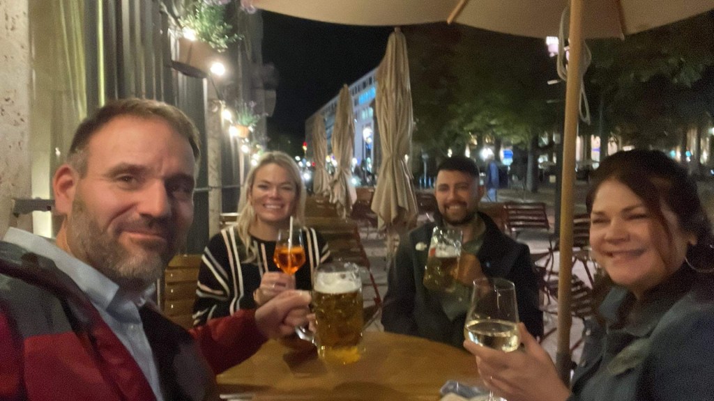 We had some visitors this week. On Friday, Ray and Susan drove down from Wiesbaden to spend part of the weekend with us. Friday night, we took the train into Stuttgart and had dinner at our favorite restaurant, Abacco’s. The weather had forecasted rain all weekend, but it ended up being dry and warm. After dinner, we went out for drinks on Schossplatz and it was so warm, we sat outside and were able to take our jackets off!