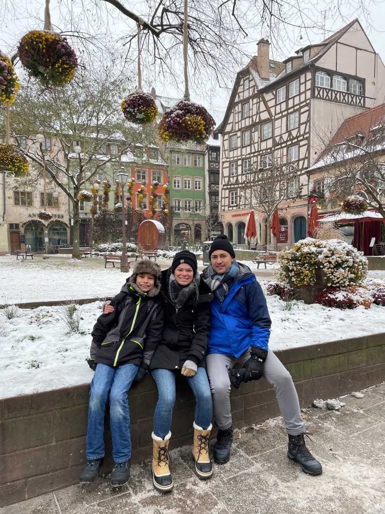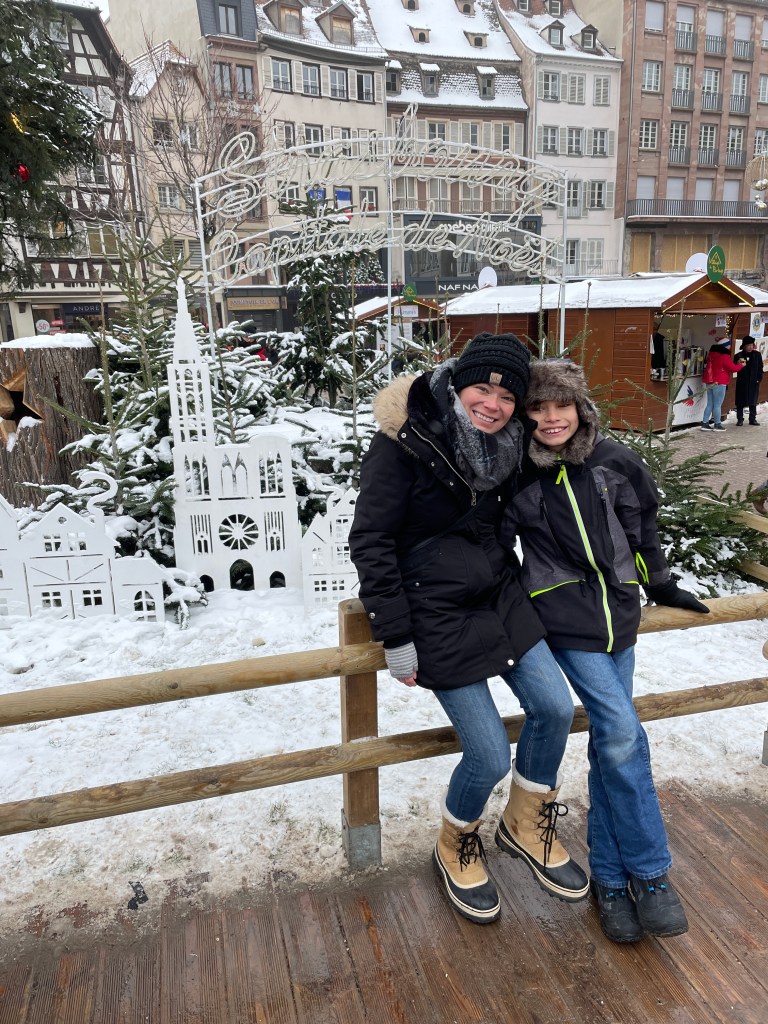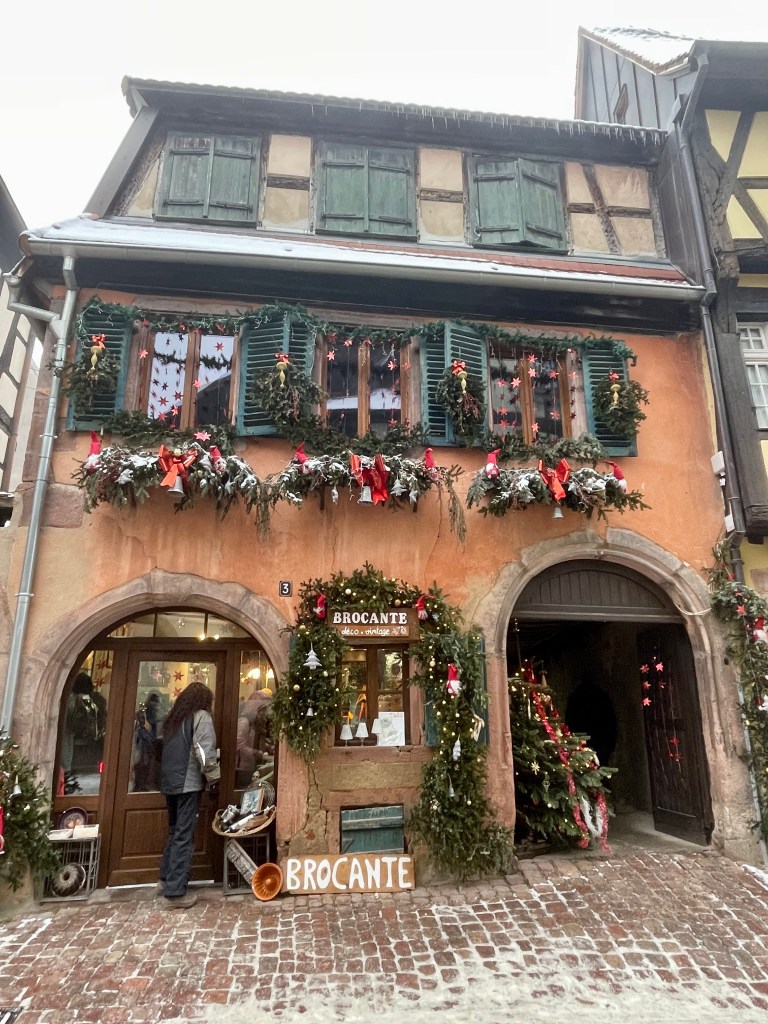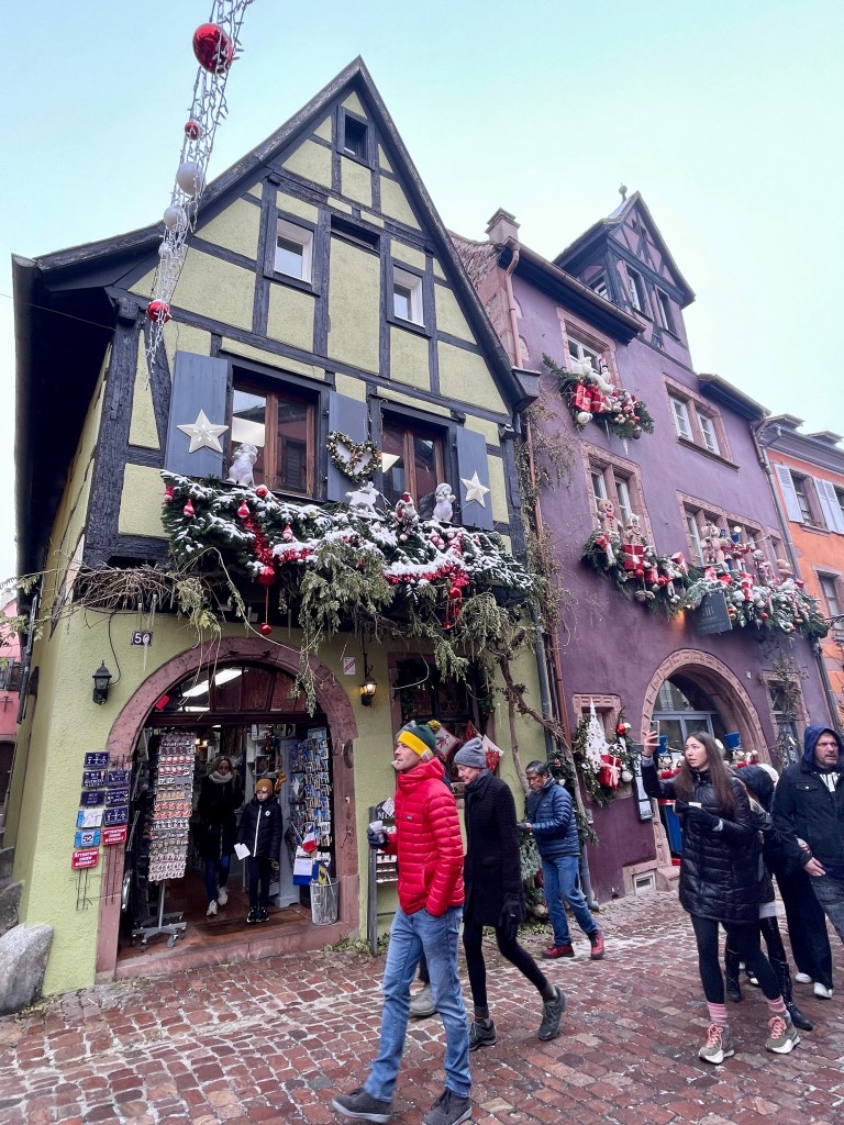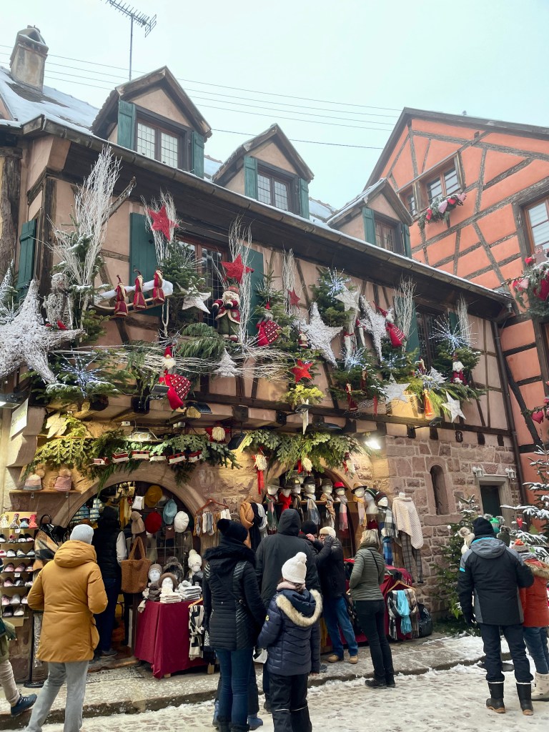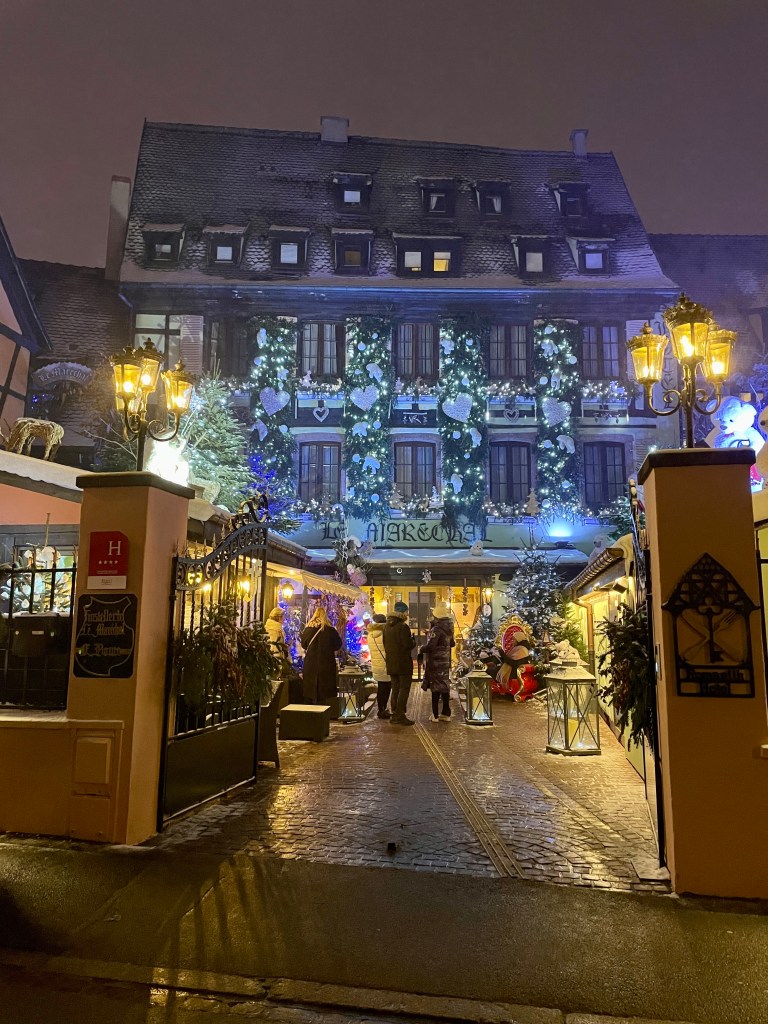 Next we headed to Colmar, which is a larger town/smaller city. We walked the whole thing, and did lots of shopping and eating. It was so cold, Matt even stopped and bought new snow boots. The decorations were so beautiful though. Somehow the French manage to decorate every inch of the outside of buildings without it looking tacky, or like Clark Griswald’s house. We were treated to a few snow showers which made it even cuter.
