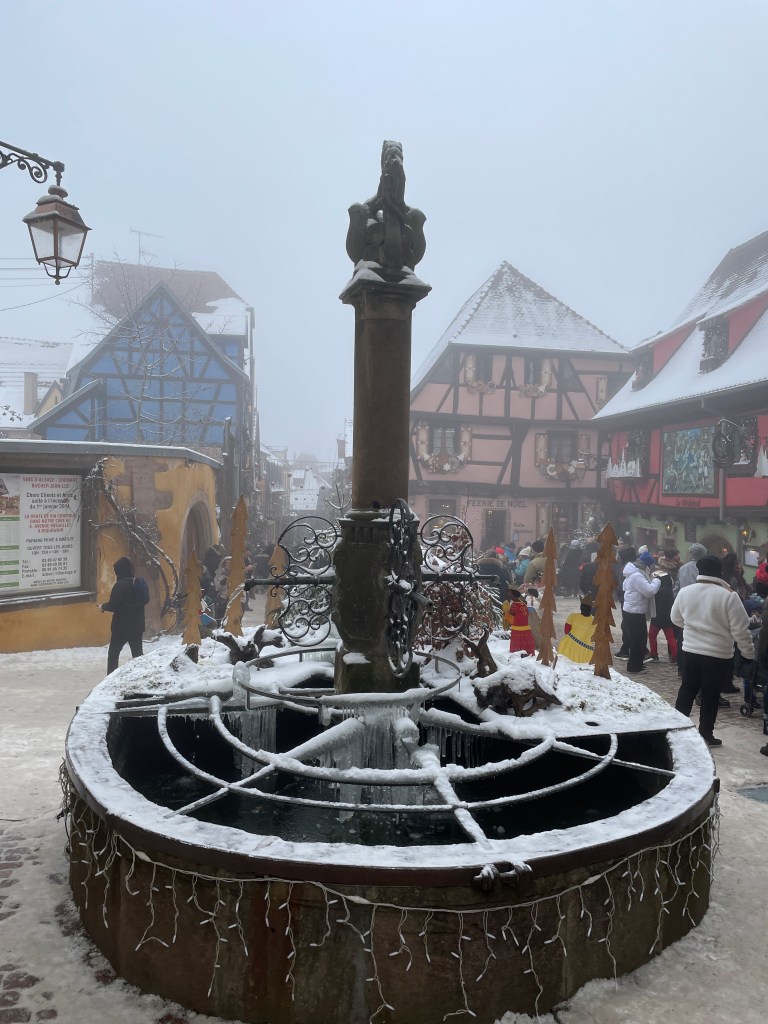 Our first stop was Riquewihr, a smaller village on the Alsace Wine Route that was one of the inspirations for Belle’s village in Beauty and the Beast. It had been super cold for a few days and at this point was down in the teens and super foggy. We drove in past miles and miles of vineyards, but almost couldn’t see them due to the fog. The village was packed and it took us about 45 minutes and lots of circling to find parking. Eventually we found a spot to park on the outskirts of town in a field. It was all worth it though!