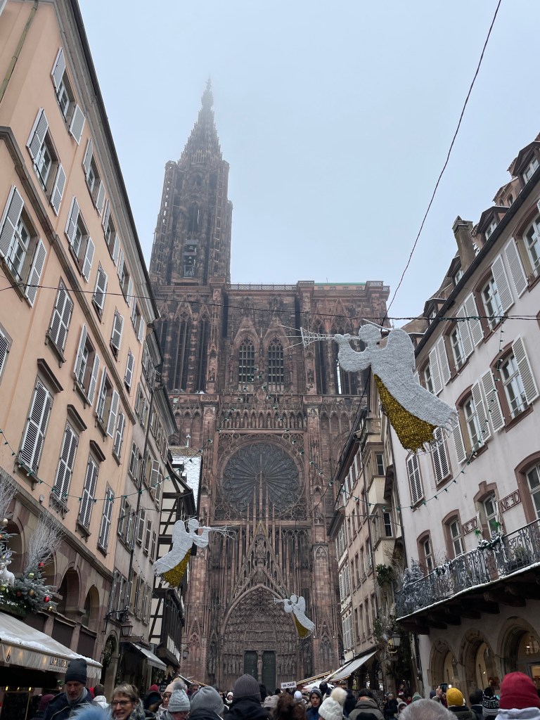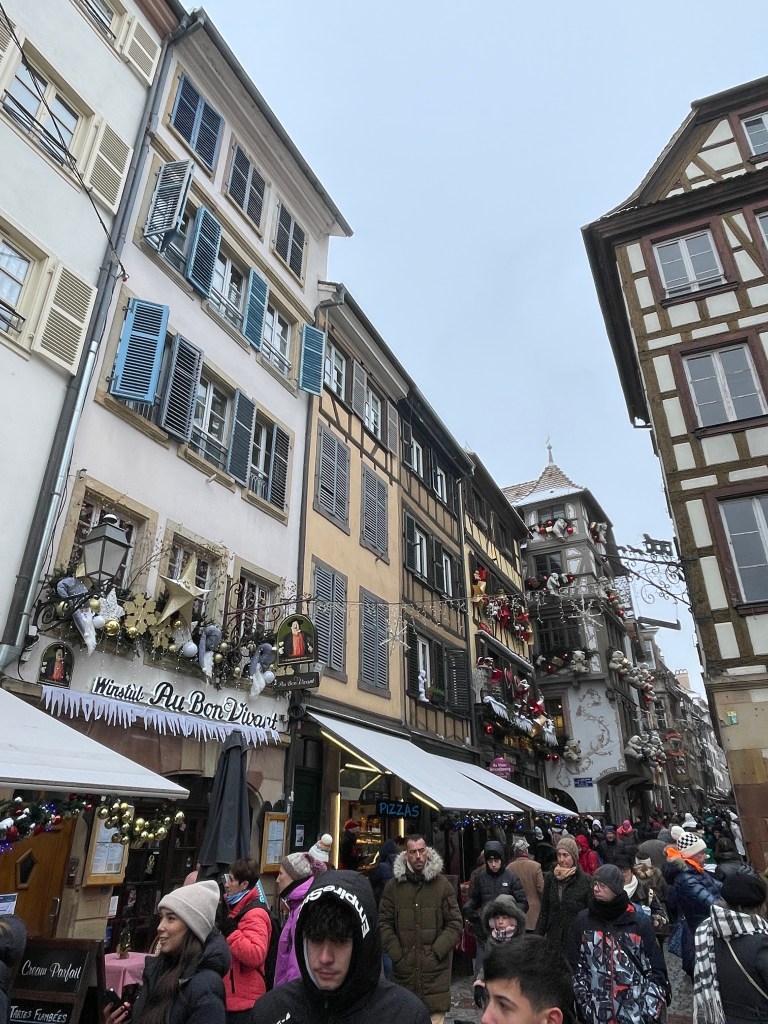 After breakfast, we walked a long route through the city’s Christmas markets. Even the food at the markets is gourmet; fois gras, raclette, and roasted duck were just some of the things we saw. Poor Ryan and his super sense of smell really suffered because it smelled so strong of Raclette everywhere. If you’ve never smelled Raclette before, I would describe it as a cross between feet and dirty laundry. Sadly, there were almost no ceramic mugs to be had the whole weekend as almost everywhere was serving vin chaud out of plastic cups. I read somewhere online that many markets just ran out of mugs early this year. For many markets, it was the first time they had been held in three years so many people were visiting them and then also keeping the mug instead of returning them for the deposits back.