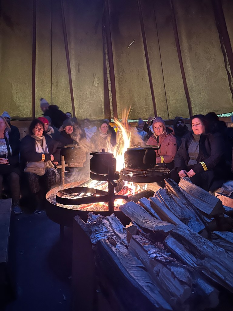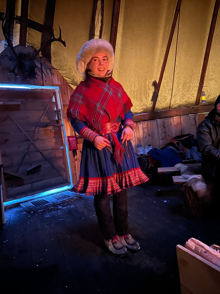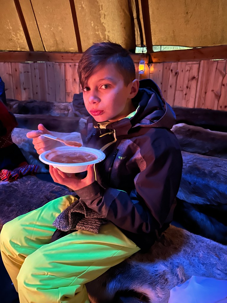After our sleigh ride, we went inside a yurt where we were served lunch and told all about the Sami tribes’ history and traditions. Lunch was… reindeer stew, which was really hard to eat after playing with the reindeer all morning. To be honest, it didn’t really have much flavor and paired with the thoughts about the reindeer, I don’t think any of us finished our lunches. The exception was Ryan who ordered the vegetarian option, which was pretty delicious.