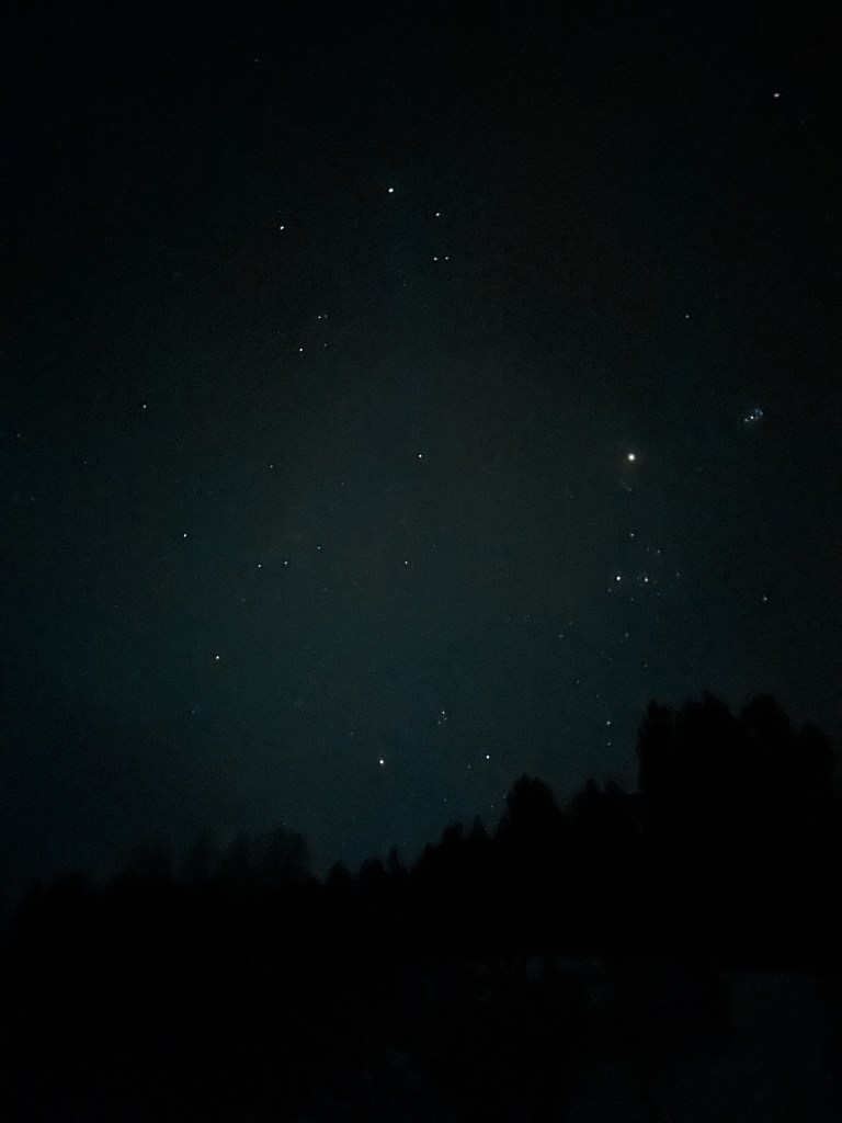After our dinner, we headed back to the bus terminal and joined a Northern Lights Chase. Normally, it is too bright in the city to experience the Northern Lights, so you can either go to a camp out in the middle of nowhere, or jump on a bus that will drive around looking for clear, dark skies. I chose the bus because I thought that would give us a better opportunity. We got on at 5:45 and the bus drove us over two hours inland, to a super dark area, just a few minutes from the Finnish border.