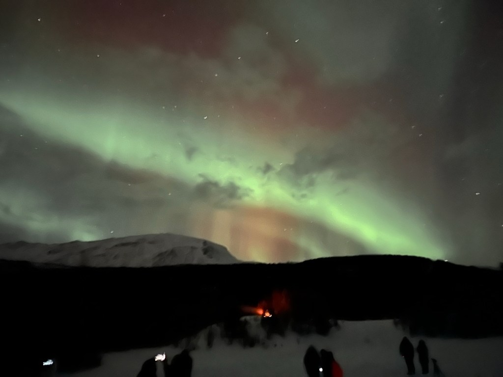 The lights stayed active while moving to different areas of the sky for about two hours. We walked around and took a ton of videos and pictures. When the lights took a break, our guide built a fire and then explained the scientific phenomenon of the Aurora Borealis. They served hot chocolate and cookies, and after about an hour, the lights started back up again.