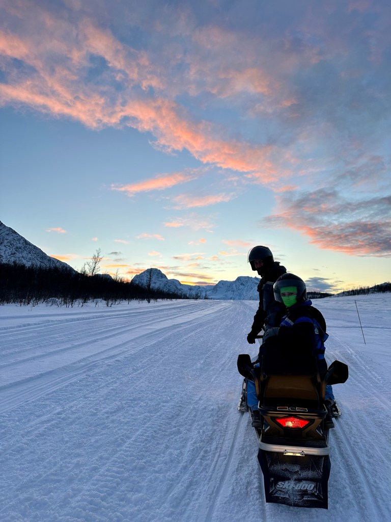 We got suited up and headed out in a line of snowmobiles on trails through the mountains. The sky was so pretty; for about an hour it was filled with pink clouds in between “sunrise” and “sunset.”