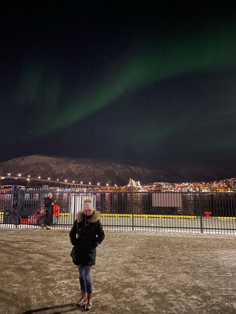 After dinner, the kids wanted to go to bed so we took them back to the hotel, then stopped at a pub down by the harbor. After a beer, we went to leave and noticed lots of people standing around the harbor front, looking up. At first I was confused but we quickly realized that The Northern Lights were out! We could not believe that we were able to see them, not only due to the weather being what it was, but that we saw them in the middle of the bright city!