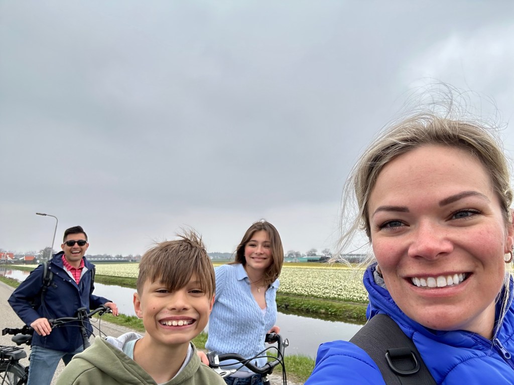 Sunday morning, we got up early and drove to the city of Haarlem to rent bikes. The bike route from Haarlem to Keukenhof Gardens is one I had done before with friends and could not wait to do with my family. Matt has been working hard at physical therapy just so he could be back on a bike in time for this trek. We had no issues getting the bikes and making the almost 20 kilometer ride to Keukenhof.