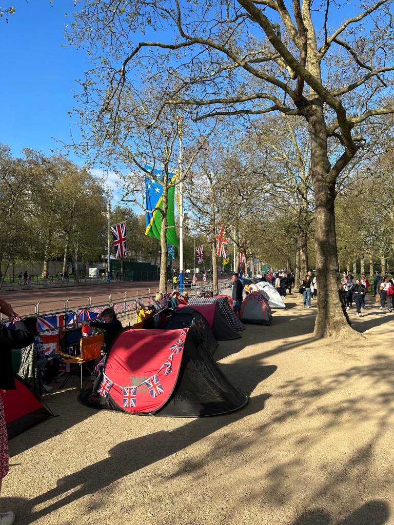 We crossed back over the Thames on the Jubilee Bridge, down the Strand to Trafalgar Square. From there, we went around the Admiralty Arch (which was now closed for the coronation). Then, we walked all the way down The Mall to Buckingham Palace. People were already camping out for the procession on Saturday.