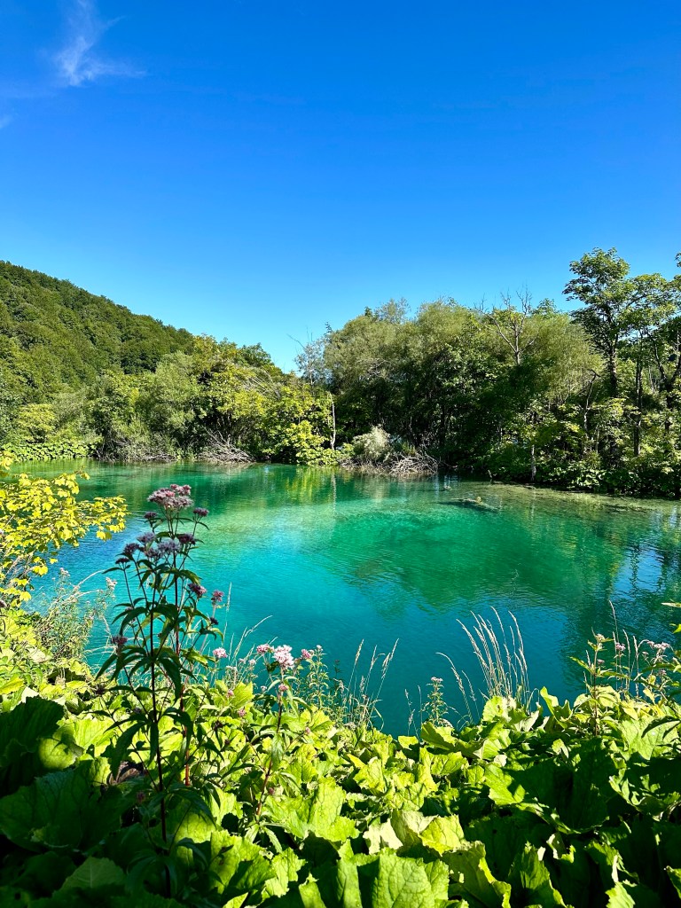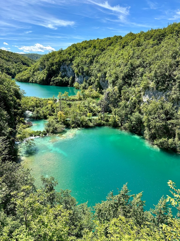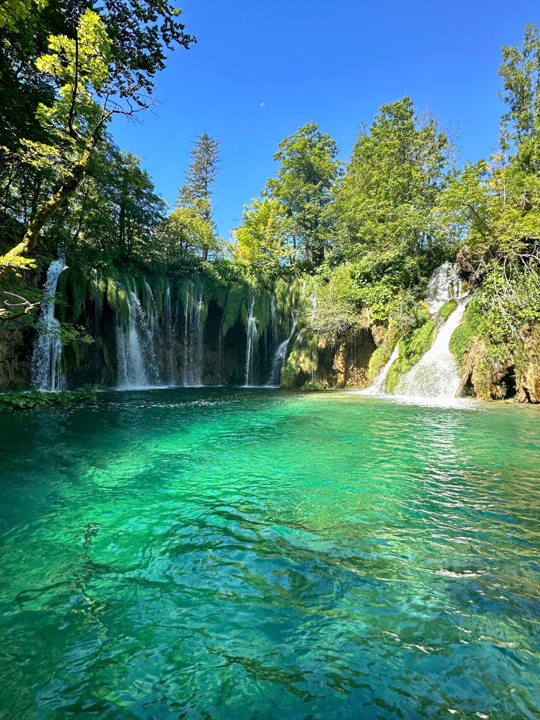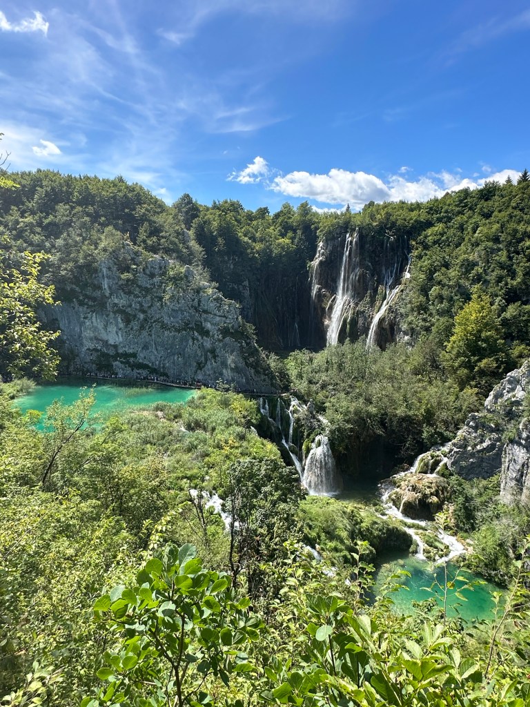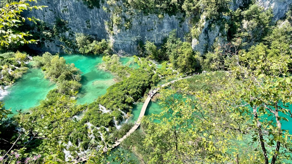 We entered the park right away, but this meant the famous waterfall and gorge were hidden in shadow. We had a coffee and hung out at the start for awhile, and then re-entered an hour later. The gorge was still in shade, but the sun was starting to come through. Plitvices Lakes is a series of sixteen lakes at different elevations, all connected by waterfalls. It is famous for its super green-blue water.