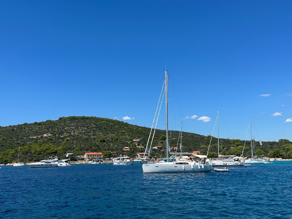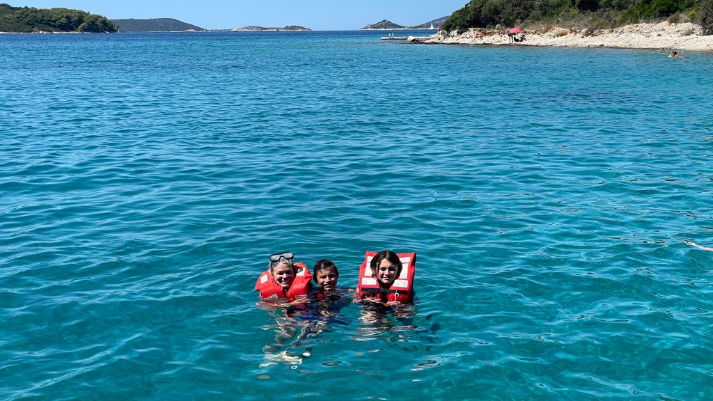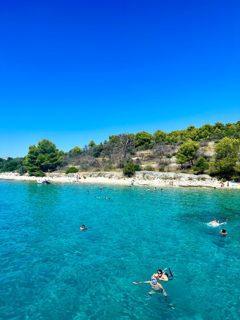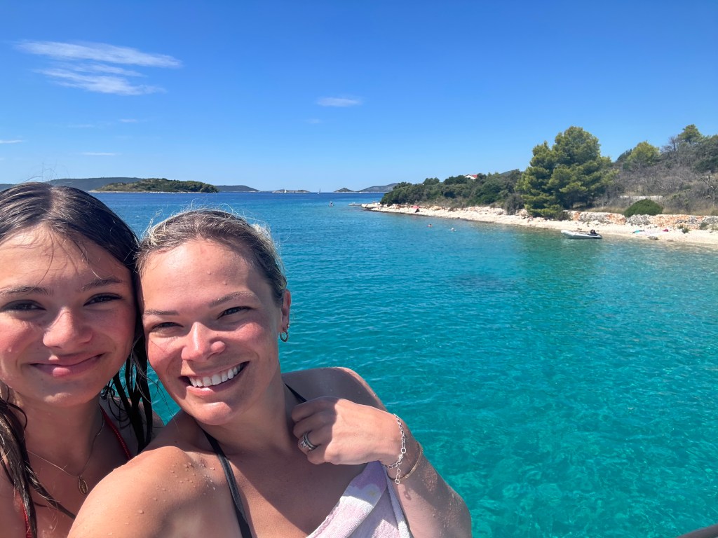 The boat took us out into the islands and the “Blue Lagoon” that surrounds Split and made three stops. The first stop was about an hour cruise from Split and was close to a beach with really clear water. The boat put its anchor down and everyone jumped in. The water was actually pretty warm and a lot of us swam all the way to the beach. The boat gave us snorkel masks and after we had already walking around by the beach, we looked in the water and discovered the sea floor was covered in sea urchins. There was almost nowhere to put your feet and we were amazed that no one had stepped on one already. It only took about another two minutes before Brooklyn did step on an urchin and we needed to swim back to the boat where we worked to pull the needles out. Luckily, she made a speedy recovery, once they were removed but we were cautious about putting out feet down after that.