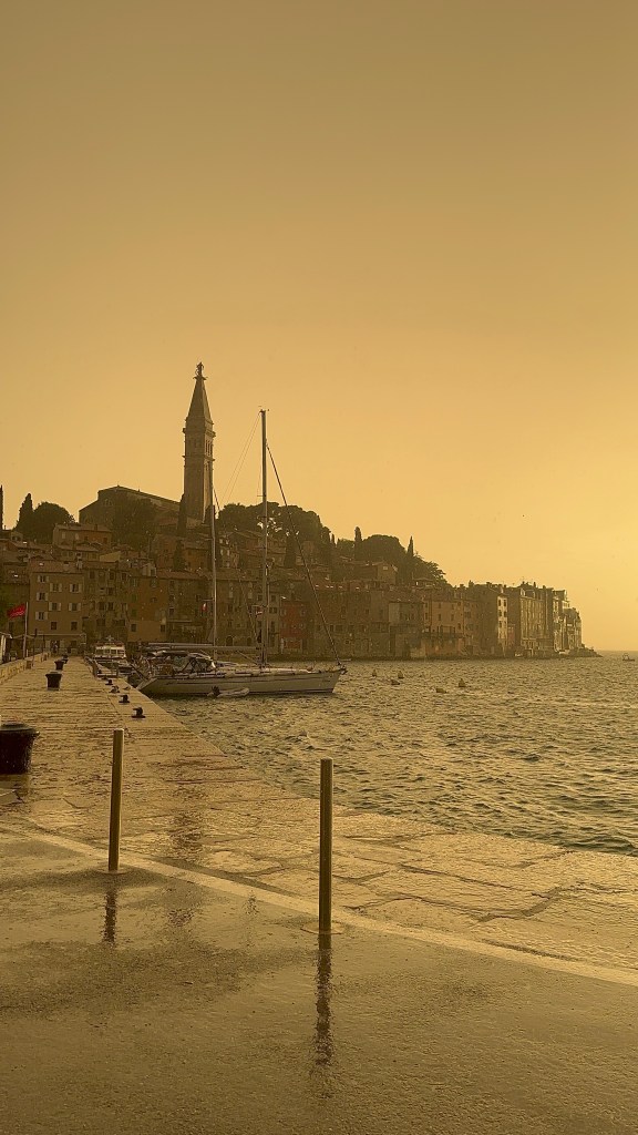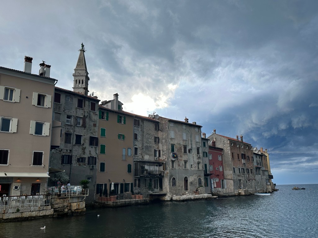 For dinner, we drove into Rovinj’s old town and attempted to do a walk around the medieval city but we started getting blasted by strong winds and whipped-up sand. As we started walking back towards the town square, it started hailing and pouring rain. We took shelter in the first open building we found while the hail continued pounding down.