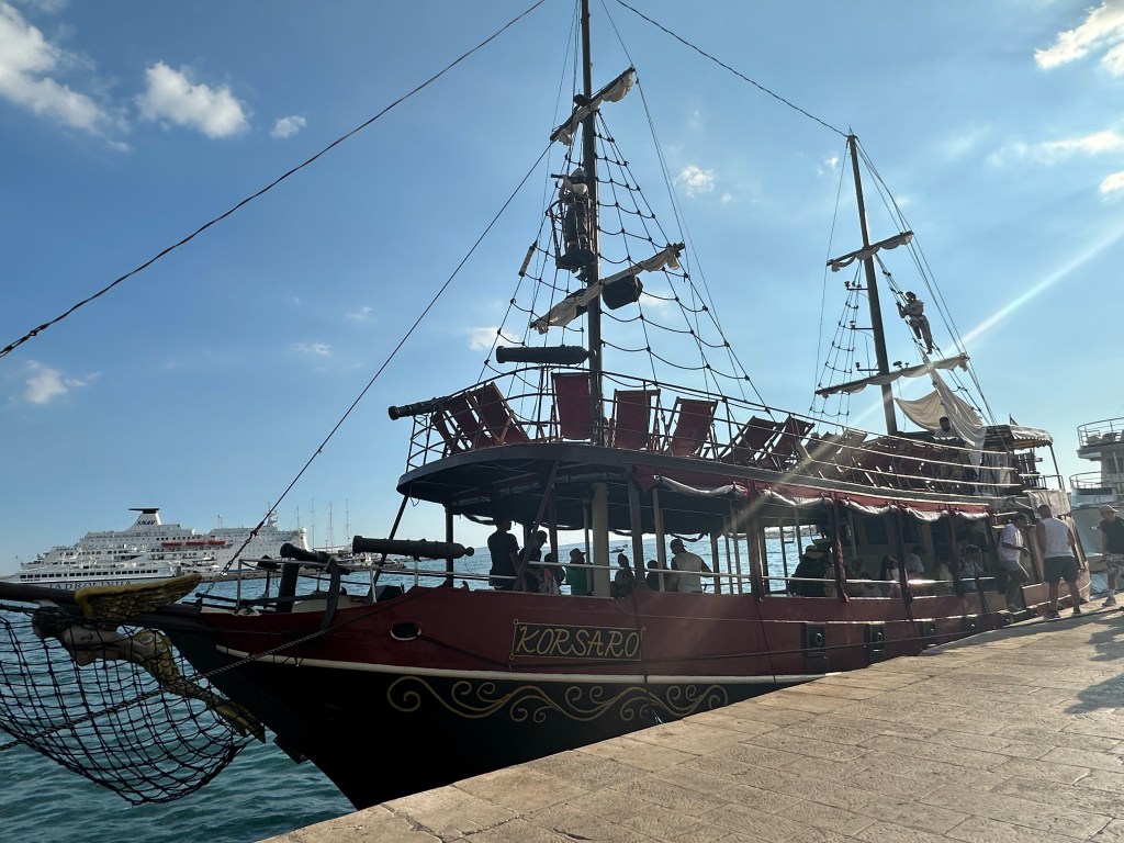 Thursday, we went on a day-long boat tour. This was everyone’s favorite day of the week and the main reason for me planning a trip to Croatia as a friend of mine had raved about doing a similar boat cruise. We met the boat right on the Split waterfront, which they call the “Riva.” I surprised the family by booking the boat cruise on a pirate ship. This probably wasn’t really a surprise for them though. Just about every beach destination in Europe has some kind of pirate cruise ship that is always playing loud music and I’ve always said I wanted to go on one. I had really talked them up the whole trip so when Matt, Brooklyn, and Ryan saw the boat, they could do nothing but laugh.