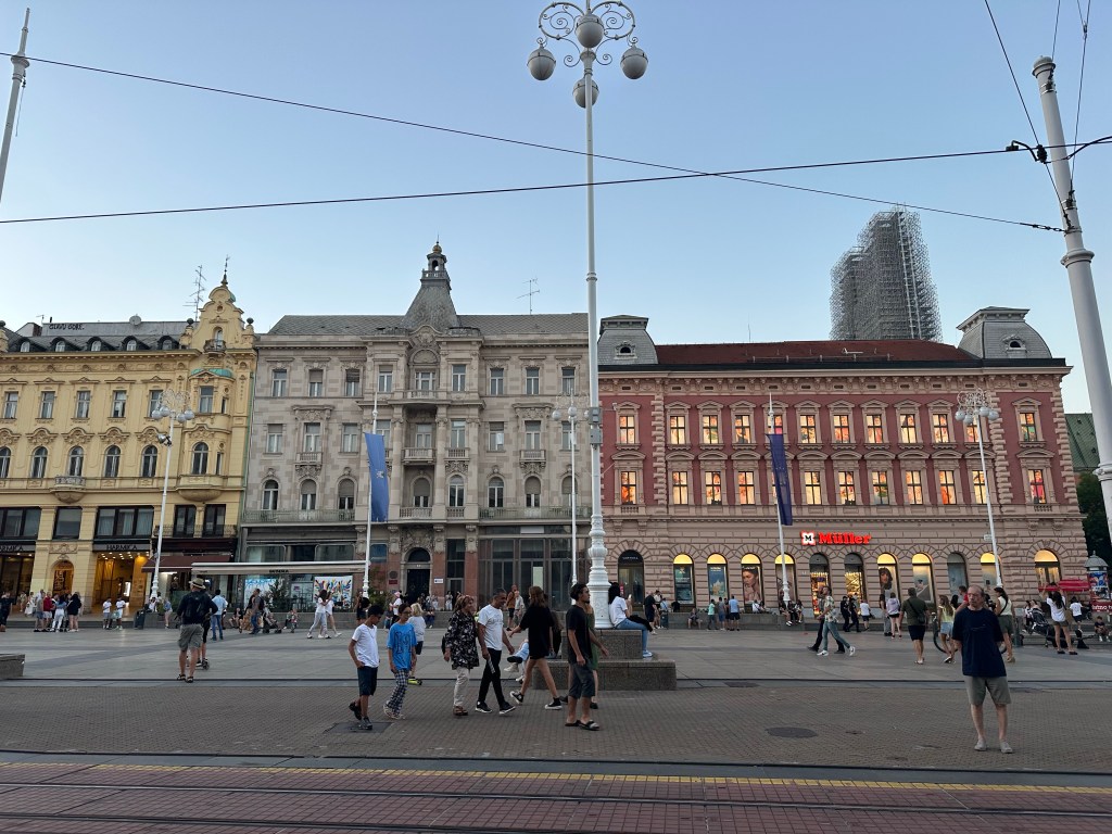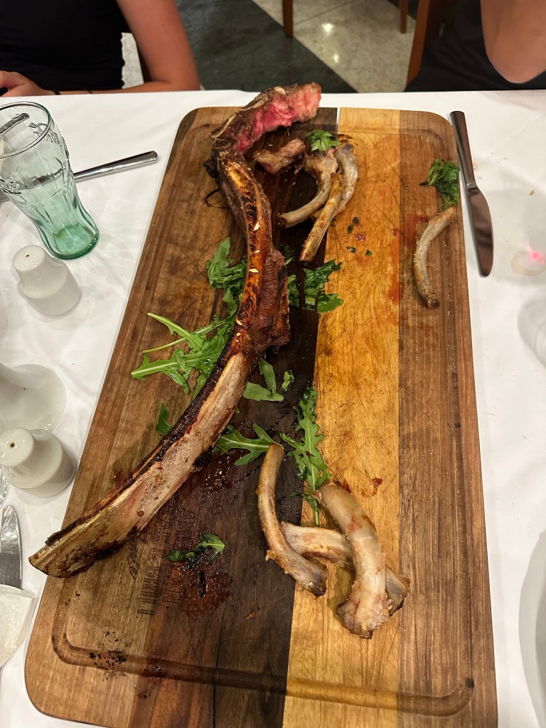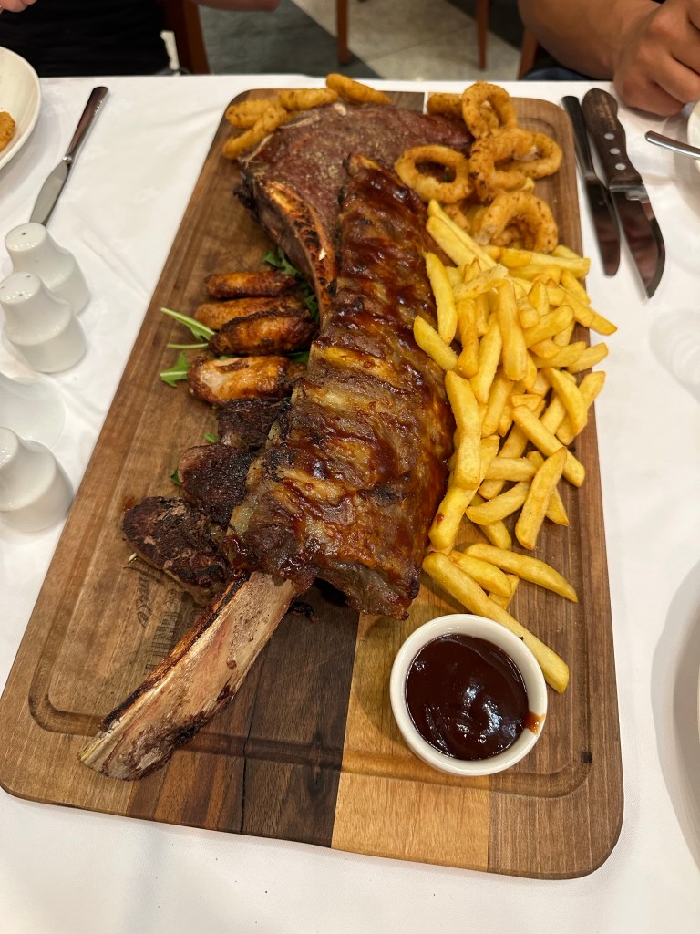 After we got to Zagreb, we checked into our hotel, we did a short walk around the city. There were hardly any people anywhere until we approached the Main Square, which was packed. We ate dinner at the “American Grill & Steakhouse.” Matt and I split the “American Combo” which consisted of three filet mignons, a tomahawk steak, a full rack of ribs, chicken wings, french fries, and onion rings and it was cheap! The entire family could have shared it so we regretted having the kids order their own meals. The ended up having to help us finish it.