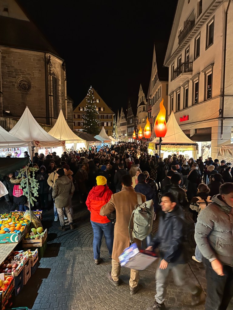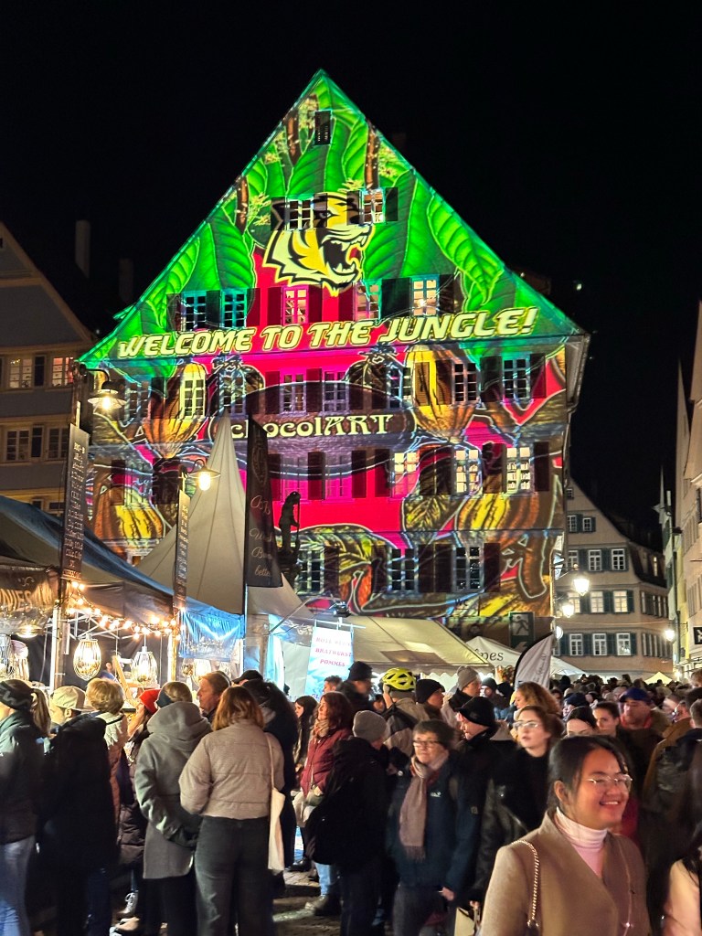 On Wednesday, Matt, a friend, and I visited the Tübingen International Chocolate Festival, chocolART. The festival is held for five days each December and has a unique theme each year. This year’s theme was Colors of Latin America. Vendors from all over the world come to sell their chocolate, offer chocolate and praline tastings, and display chocolate sculptures and paintings. As it was last year, it was packed, but we did manage to sample and buy some chocolate and fudge, and have a glüwein.