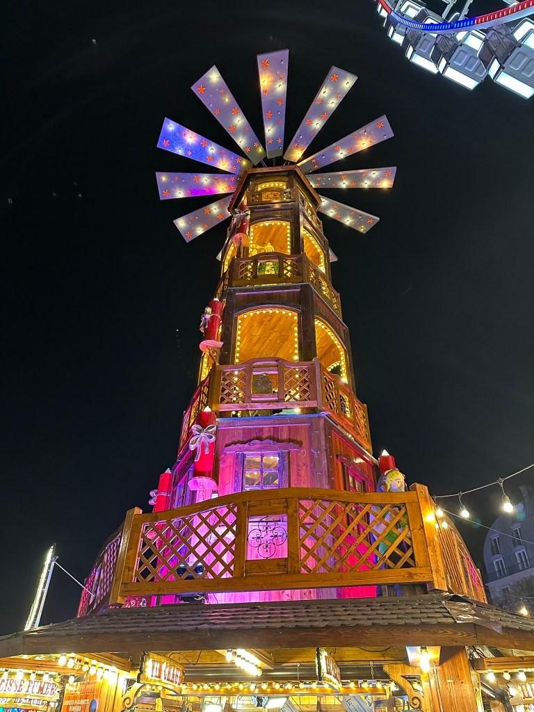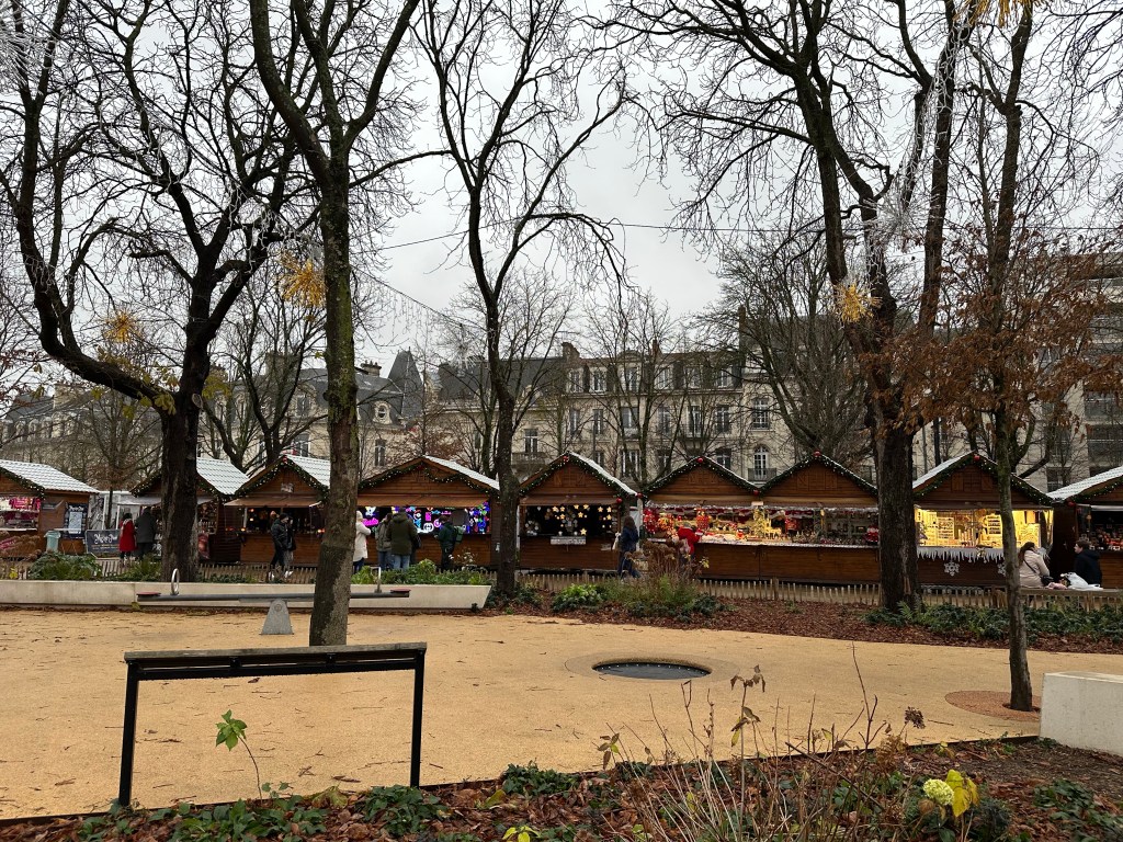 After we had lunch at Pitaya, we walked down to the Reims Christmas market. This market was a little different; it was previously held in the cathedral square, but this year was moved to a park and fenced off. We went through metal detectors and had our bags searched in order to enter. Once in though, we found the market was pretty big and not too crowded. We did a loop of the stalls while I had a Vin Chaud. Unfortunately, there are no mugs to be found in France, but the market itself was pretty nice and would be fun to visit again as a standalone visit. Since Reims is the capital of the Champagne region, there were several vendors offering champagne tastings and lots of French food on offer.