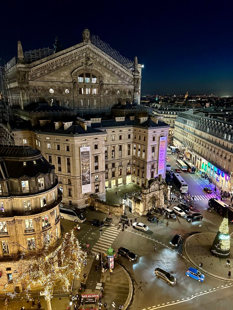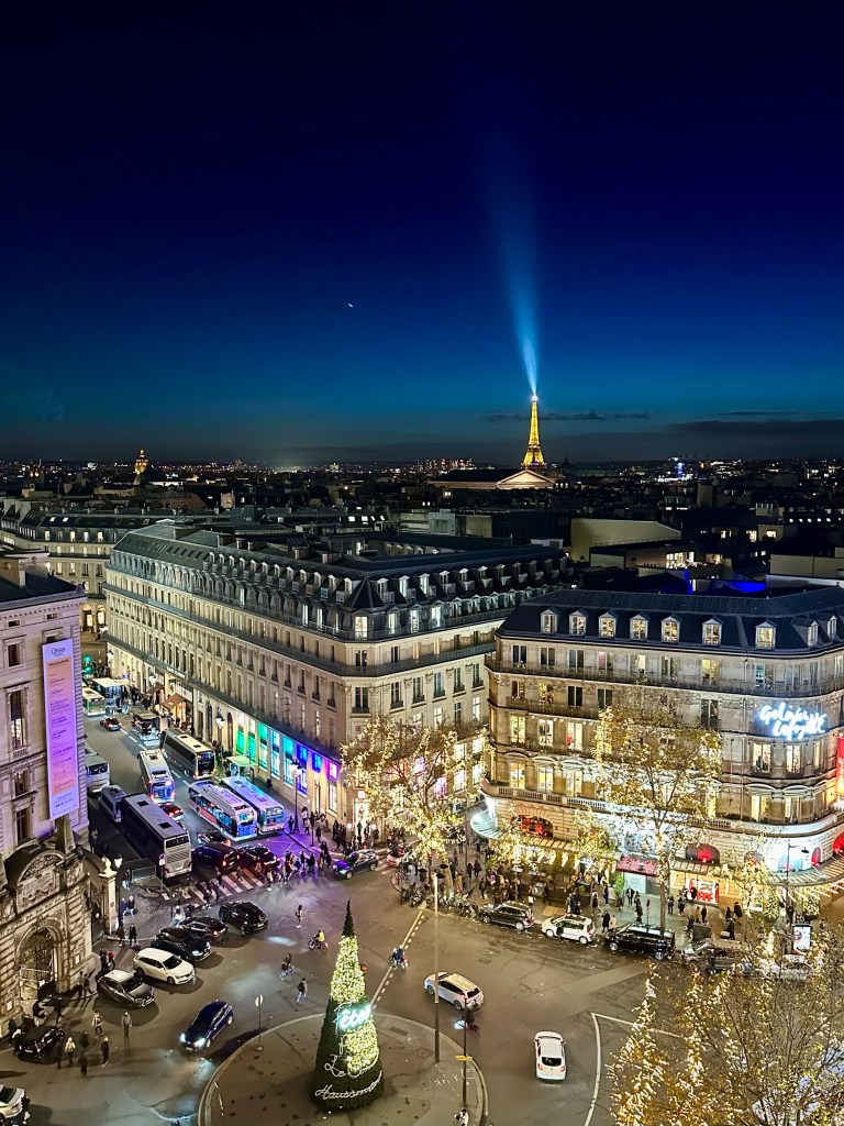 We almost left the store before I remembered there was a terrace with a great view of Paris. I am so glad we did not skip this! The sky was clear and a beautiful shade of dark blue, lit by the city lights below. The terrace overlooked the shopping district, Opera Garnier, and the Eiffel Tower in the distance. We secured a spot on the railing and realized that the we were within minutes of the Eiffel Tower light show so stayed put and watched. It was so pretty!