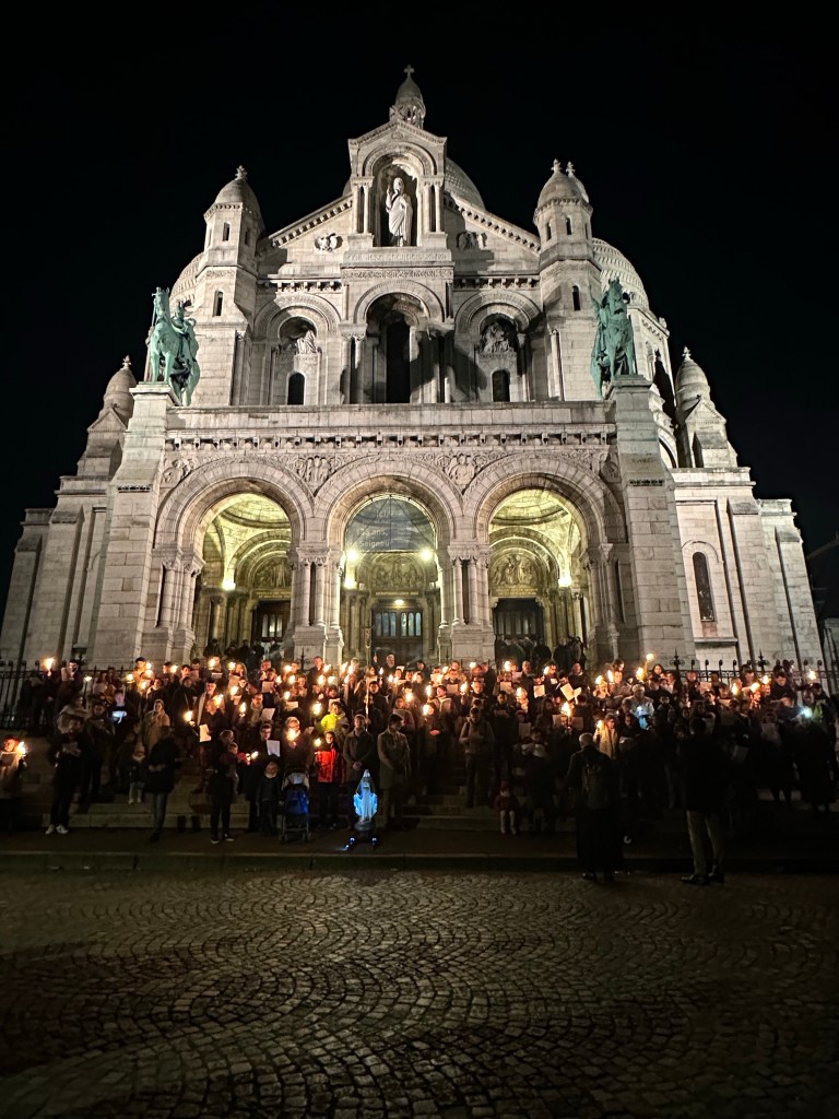After dinner, we finished our climb up Montmarte to Sacre Coure, where the church choir was singing on the steps with torches. We stayed for a few minutes and listened while taking pictures of Paris from the steps of the church, which is the highest point in the city.
