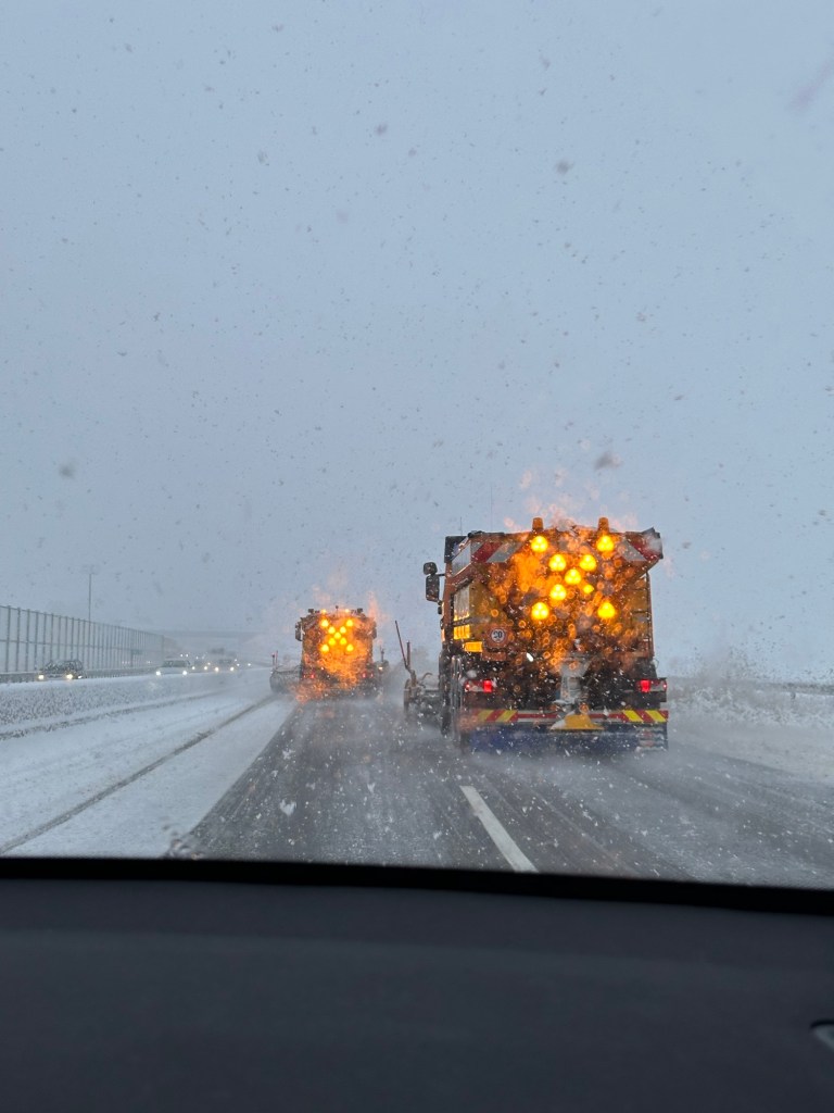 It was smooth sailing for the first two hours. Hardly anyone was traveling west. Meanwhile, we could see that traffic was really congested going in the opposite direction. When we crossed into the Czech Republic, it started snowing, at first without any real accumulation. We stopped for lunch and gas outside of Olomouc, and then got back on the road, and that’s when the blizzard began. For the next two hours, the snow was falling at a rate of almost two inches per hour and extremely windy. We slipped and slid for a lot of it, but Matt is a great driver and we carried on because I wasn’t even sure what else we could do but continue driving slowly until we were out of it. We were lucky that the westbound highway stayed open, we passed so many accidents (nothing very serious). One jackknifed truck on the opposite side of the road closed that side for 30+ miles; I am sure many of those people behind it were forced to sleep in their cars overnight on the road.
