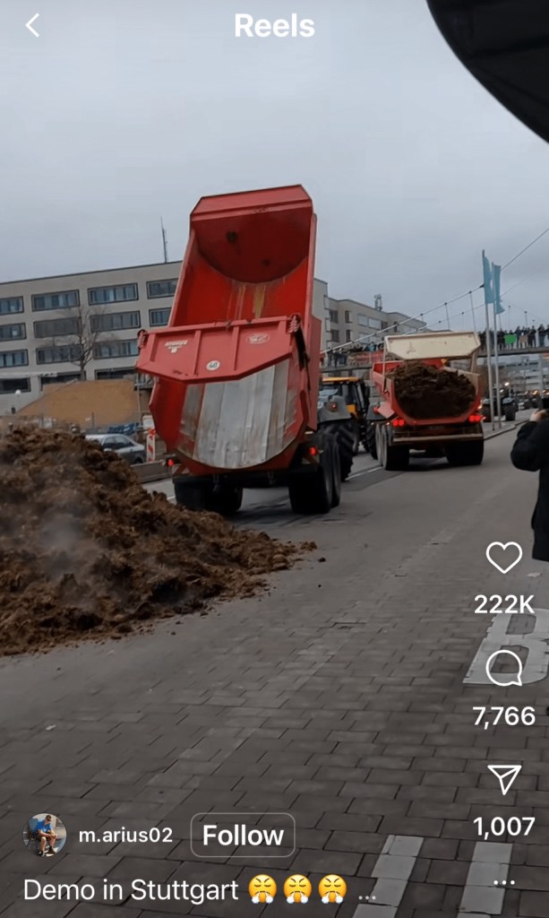 The farmers organized and ‘went on strike’ for a week. In addition to picketing government buildings, they used their tractors to shut down huge sections of the autobahn across the country by blocking travel in the two outside lanes. They also had some interesting forms of expressing their displeasure, such as dumping wagonloads of manure in front of government buildings and dropping bales of hay on the autobahns to slow travel.