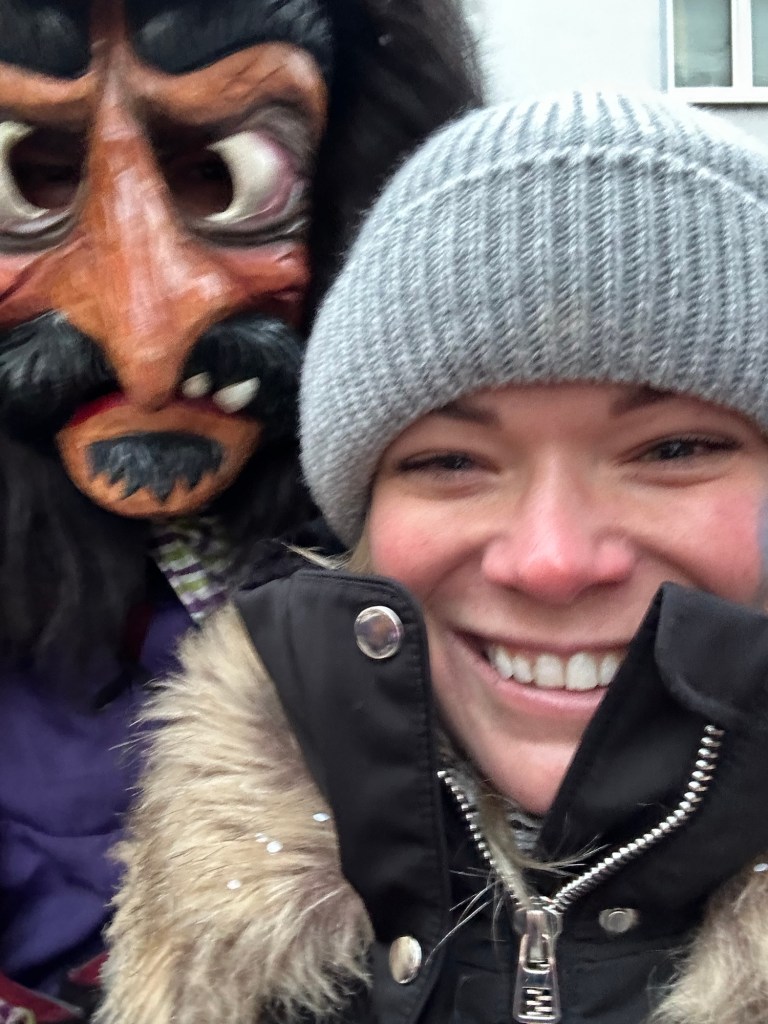 We arrived around 3pm for the pre-party, where multiple bands and drumlines from different towns were taking turns entertaining the crowd. Then, at 4pm we got in place for the parade to start. The parade was made up of different clubs who dress in different themed costumes, mostly witches and demons, although there were some animals and aliens; and try to scare or prank parade watchers. Typical pranks are drawing on peoples’ faces, covering them in confetti or shredded paper, stealing hats, scarves, or gloves, and picking up children and running away with them. We even saw one witch knock over a child on the edge of the parade. Kids dress up in their own costumes and the witches and demons give out candy.