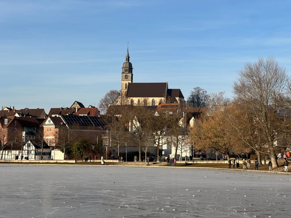 Afterwards, we headed to Böblingen Old Town. On the way, we crossed the bridge over the town lake and saw that it was frozen and people were walking around on the ice. We quickly parked and headed down ourselves to check it out. After a few minutes of watching everyone running around on the ice, Matt and I got brave enough to walk out too. We had only been on the ice for about five minutes when the police came and had everyone clear the ice. Apparently, it is illegal to walk or skate on the frozen lake. Luckily, no one got into any trouble and now we know for the future. We got some great pictures of the town from the lake and can say we’ve done it now.
