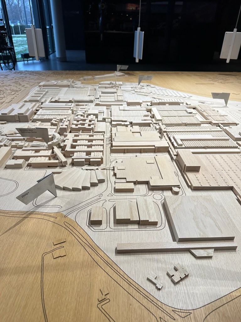 We arrived just in time for our 10:15 tour where we first watched a movie on a basic overview of the plant. Among the many interesting things we heard in the movie, we learned that the plant is so big, it is something like 3 times the size of the country of Monaco and has over 35,000 employees, yes 35,000! The plant is its own city, with its own police force, two fire stations, train station, truck depot, hospital, and more. The plant manufactures the E-Class, S-Class, EQS Electric cars, and the Maybach, as well as the armored car division. and all associated parts of production including research, design, testing, building, and delivery of the finished product. There is even a test track on site that we had no idea about since you can’t see it from the road. After the movie, we were given orange vests to wear and then loaded onto a bus to make the drive over to “Factory 56” where the cars are assembled. No cameras or phone were allowed in due to the risk of loss of trade secrets.