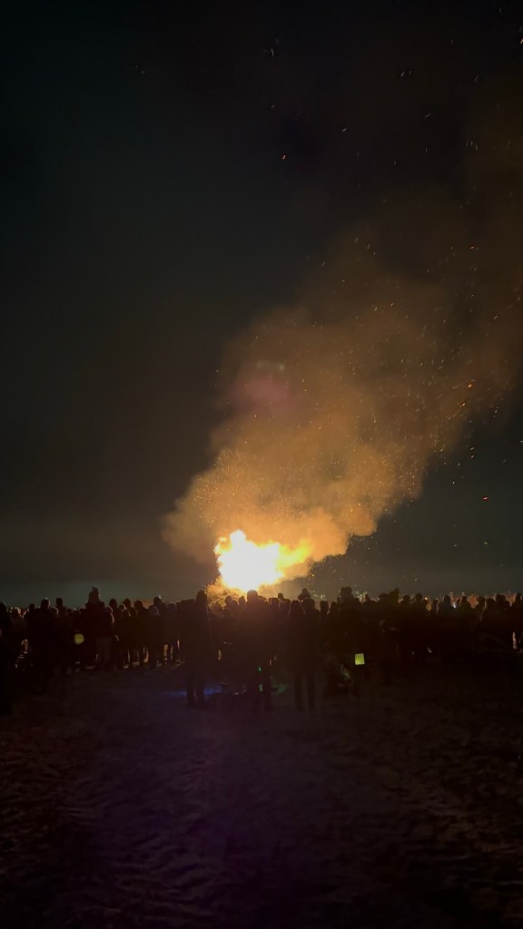 Friday night, Matt and I met some friends in Birkach for a Christmas tree bonfire. This reminded us of some we had been to back in Maryland, but on a much larger scale. Here, everyone in the town brought out their trees and the fire department organized the huge fire where they sold gluwein and kinderpunsch. The built an inner pyramid structure out of wooden pallets to support the 100+ tree pyre. It was so cool!