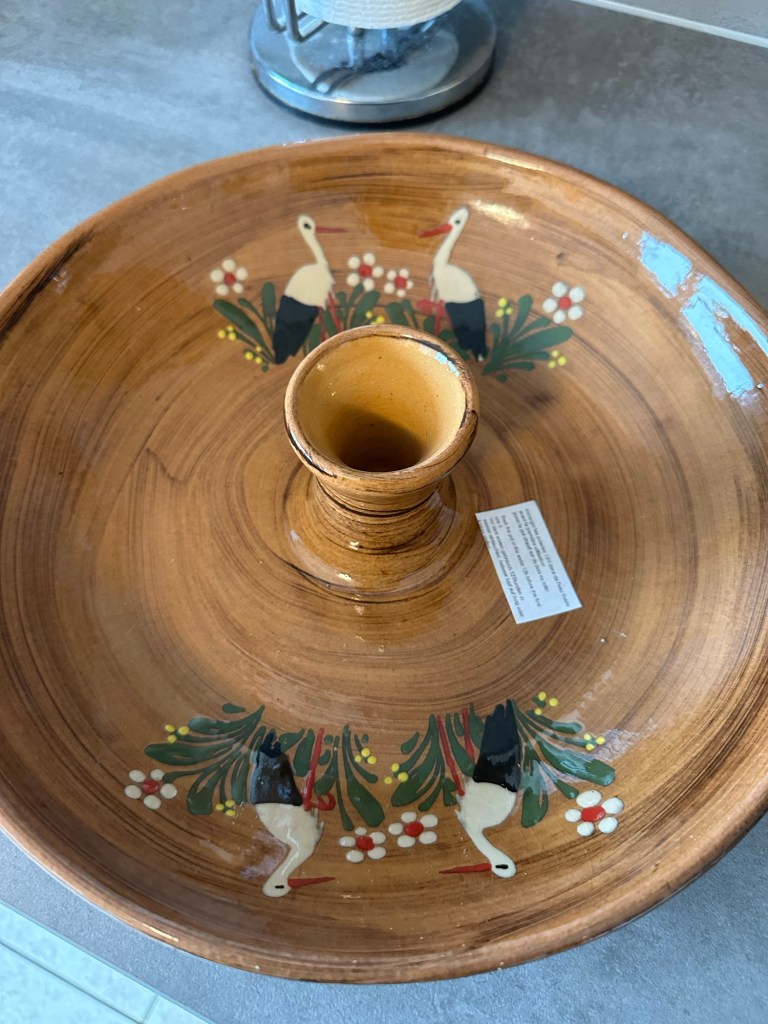 The shopkeeper also showed us a dish that he had invented for cooking poultry. The dish is shaped like a plate with high edges and in the center is a cup that can be filled with the cooking liquid of your choice; water, juice, wine, etc; and then have a bird placed on top of it for cooking. Of course, we bought one and got some recipes to try at home.