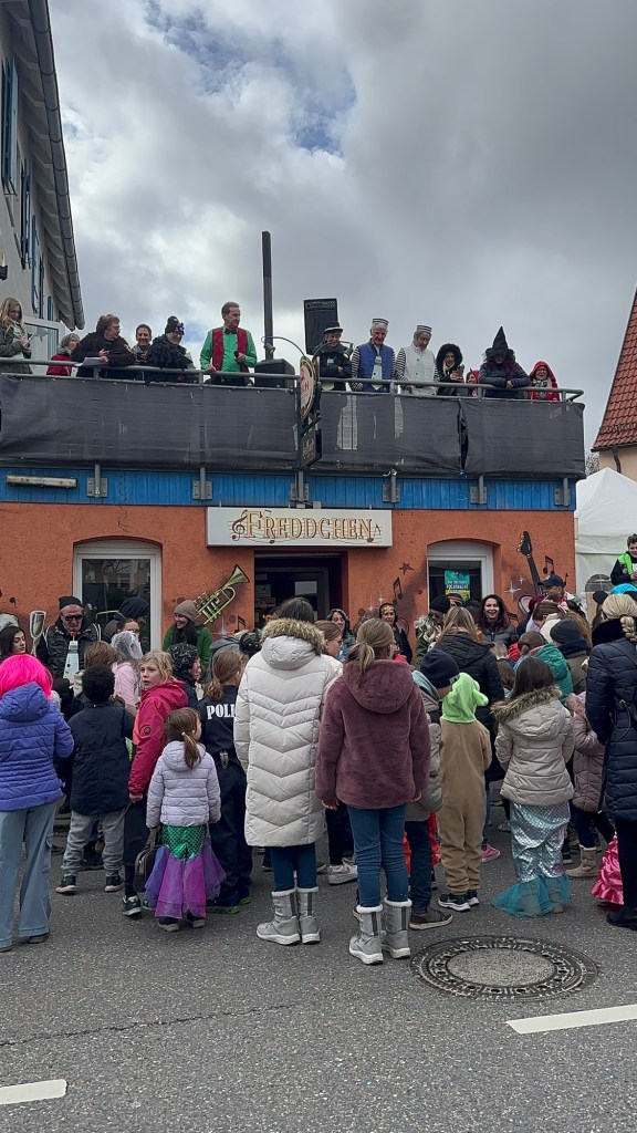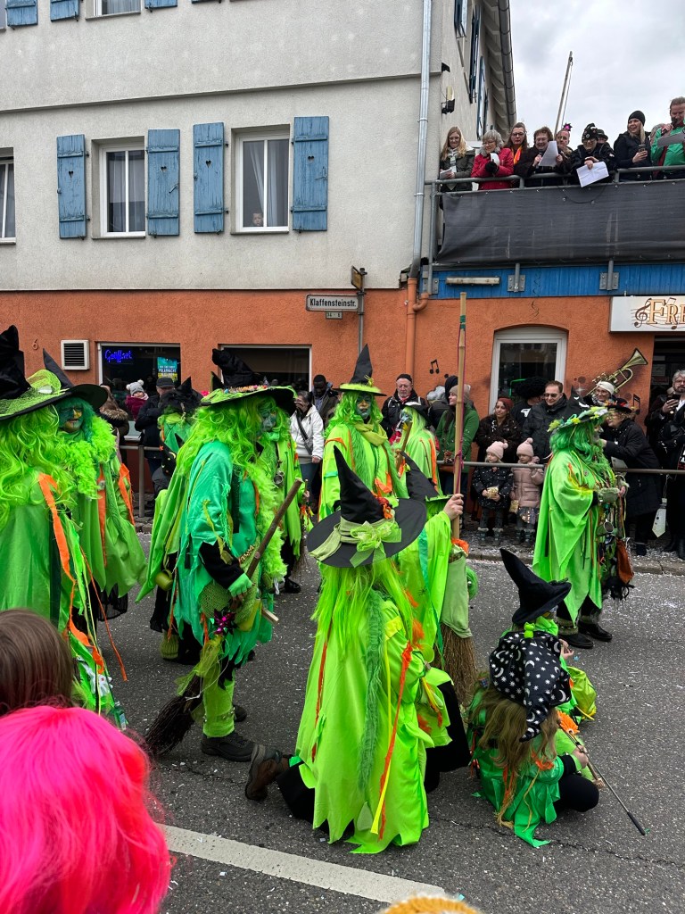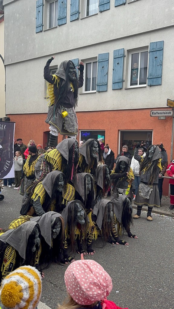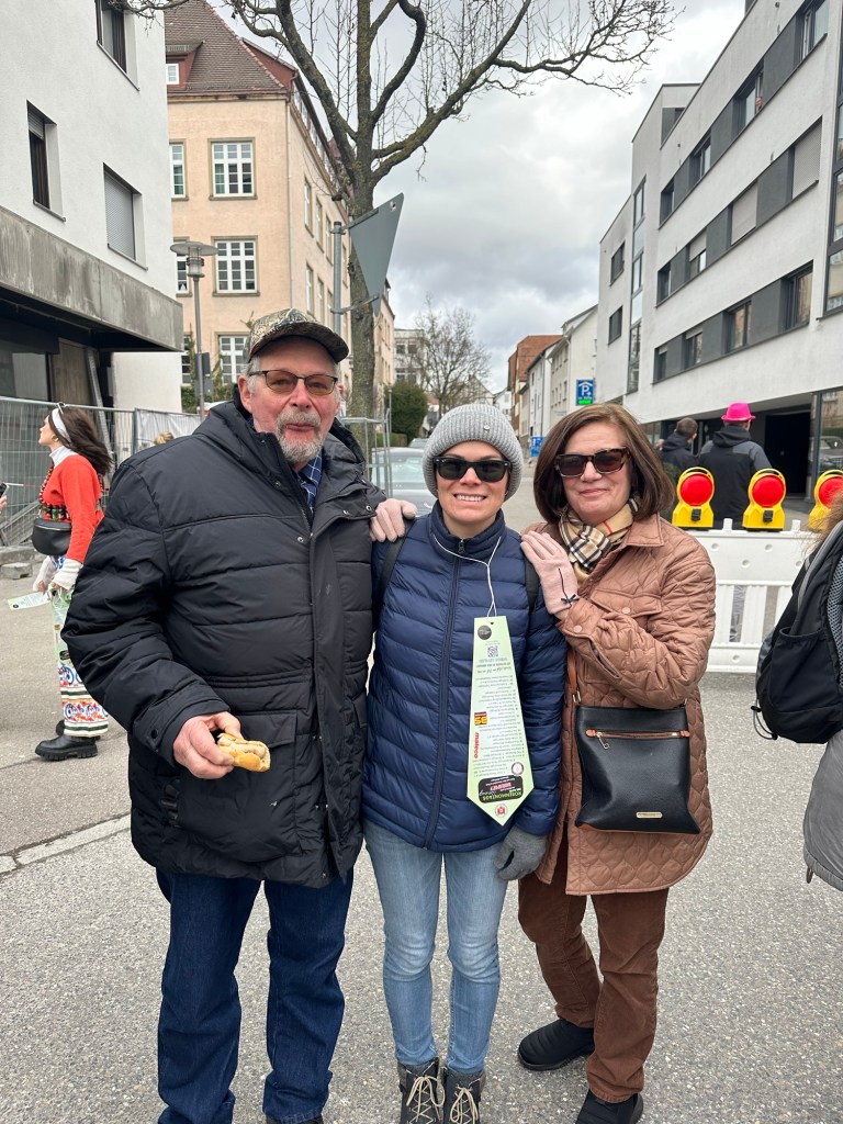 Last Monday was my parents last full day in Germany. I took the afternoon off and we were able to attend the Fasching Parade in our town. For the last two years, the Fasching parade has fallen on Presidents’ Day weekend so we’ve missed it and were glad to finally be able to attend. Compared to the previous day’s parade in Weil der Stadt, this one was a little smaller, had much smaller participating guilds, and not as many bands. However, despite the long route around the town lake, it was much more crowded and unfortunately, had a little more pushing and shoving for a place to view the displays from.