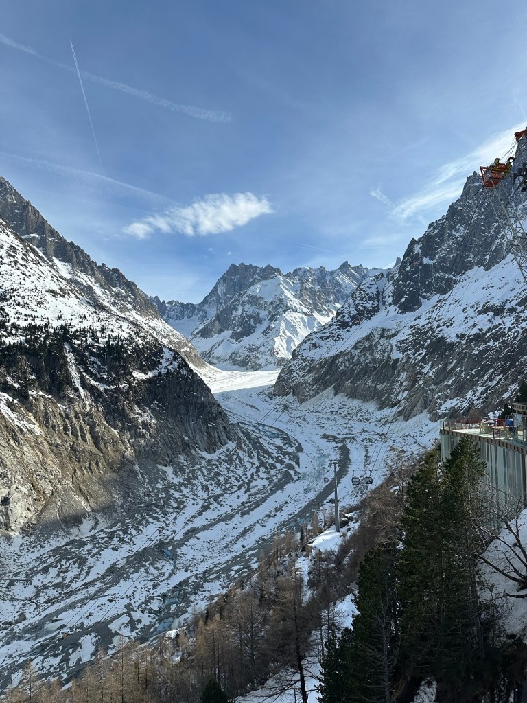 We made it all the way there in less than six hours, with only one stop for gas. We headed straight to the Montenvers cogwheel train, which would take us up to the Mer de Glace. The Mer de Glace, literally ‘Sea of Ice’ in French, is a glacier on the slopes of Mont Blanc and at over 7km long and over 600ft deep, it is one of the largest glaciers in Europe. The Montenvers railway has been operating since the early 1900s, bringing tourists up the mountain to look out onto the glacier and visit its ice cave.