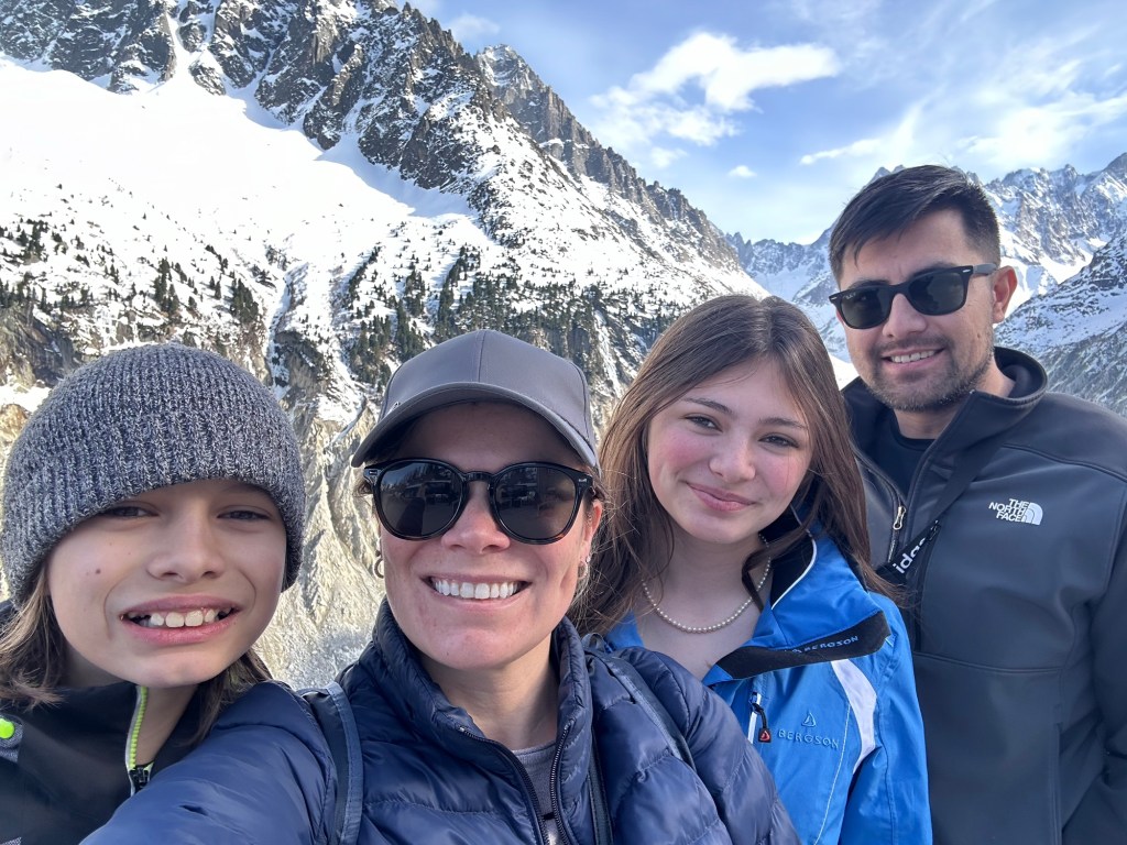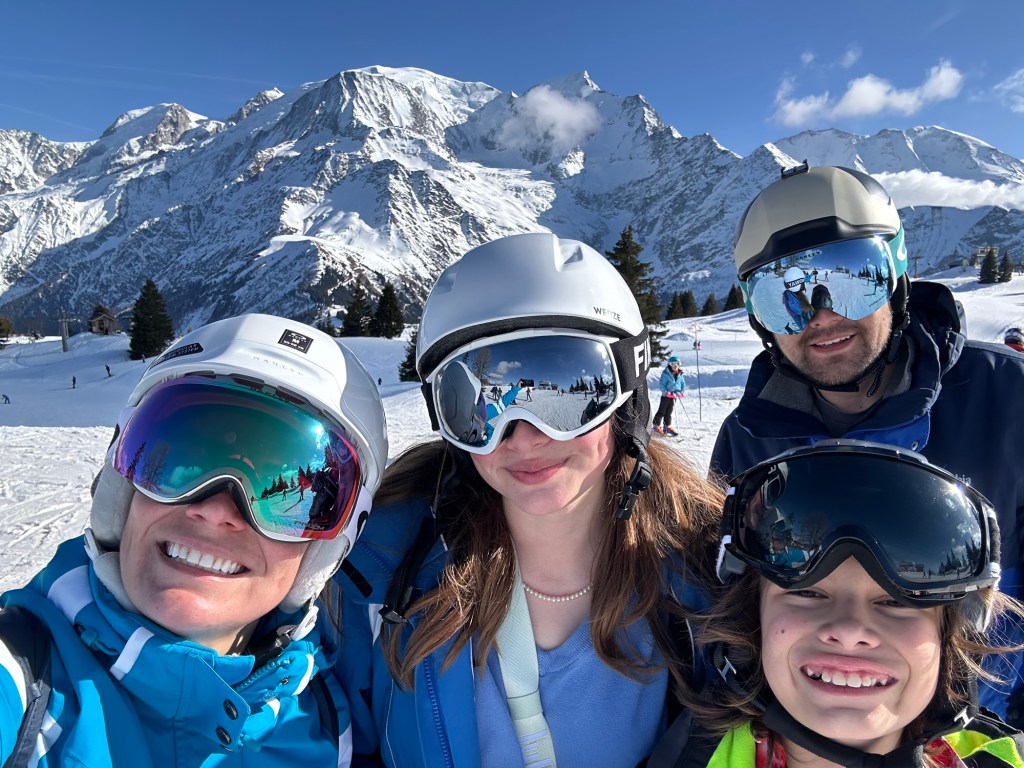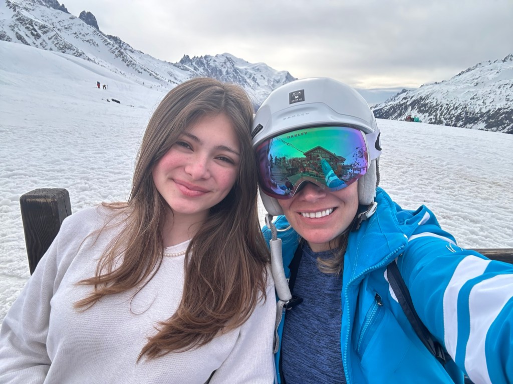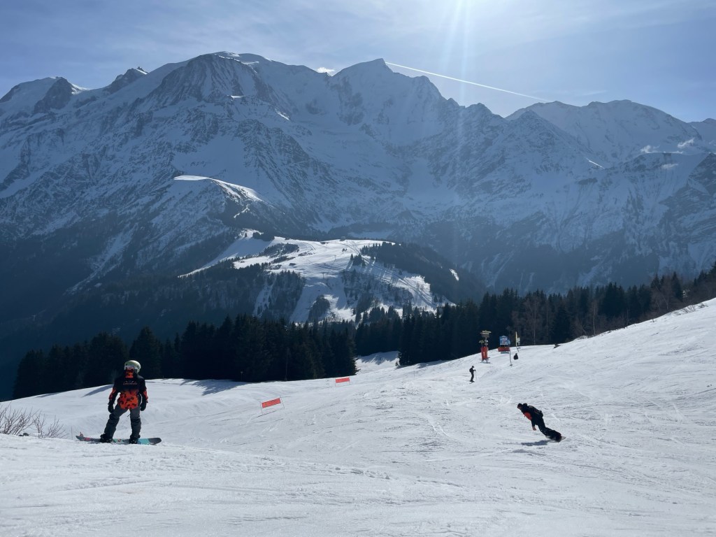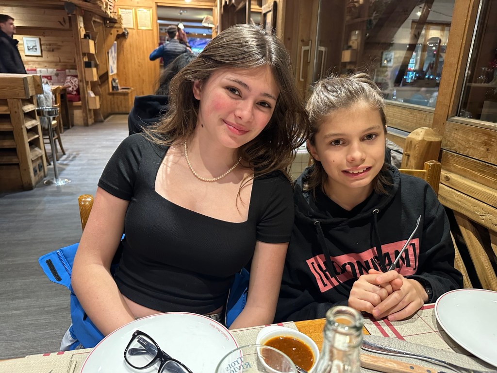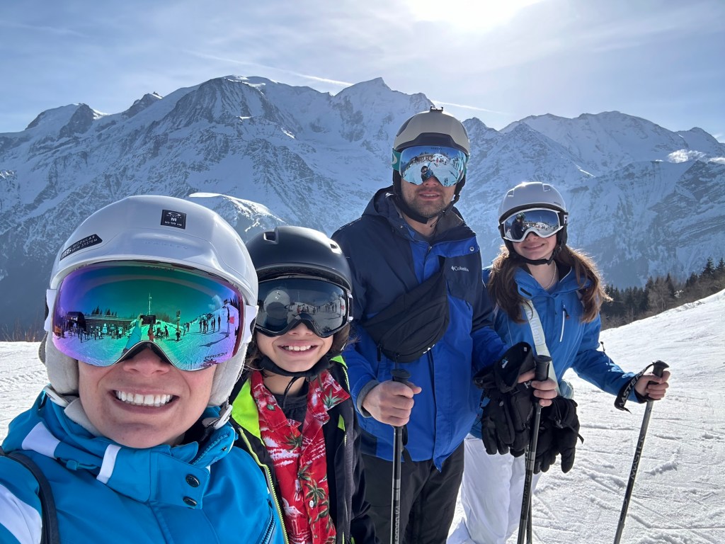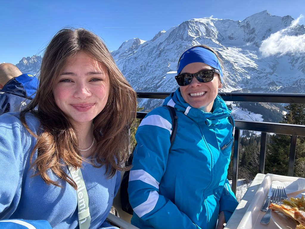 I also somehow lost my phone. I realized it had fallen out of my pocket within about 15 seconds of putting it in there, but when I turned around, it was gone! Phone service was limited so I was unable to ping it, or see its location. We skiied up and down, asking lift operators if it had been turned in with no luck. Finally, we walked up to the highest altitude we could find and finally got a bar of service to put the phone into Lost Phone Mode. Within a minute, the person who had it was able to call me and tell me that they found it and had turned it in at the bottom of the Prairon gondola. Apparently, he was the ski instructor and his group had skiied right past me as I dropped my phone and he picked it up. He didn’t see me drop it or would have just given it back to me. I still just can’t believe we missed each other by mere seconds. Anyways, we took the gondola all the way back down to obtain the phone and then had to ride all the way back up. The whole encounter probably took up an hour, but it was a good excuse for a break. At that point, it was time for the kids to check in with us at the restaurant and they were hungry so we had a beautiful lunch, right on the edge of a terrace overlooking Mont Blanc.