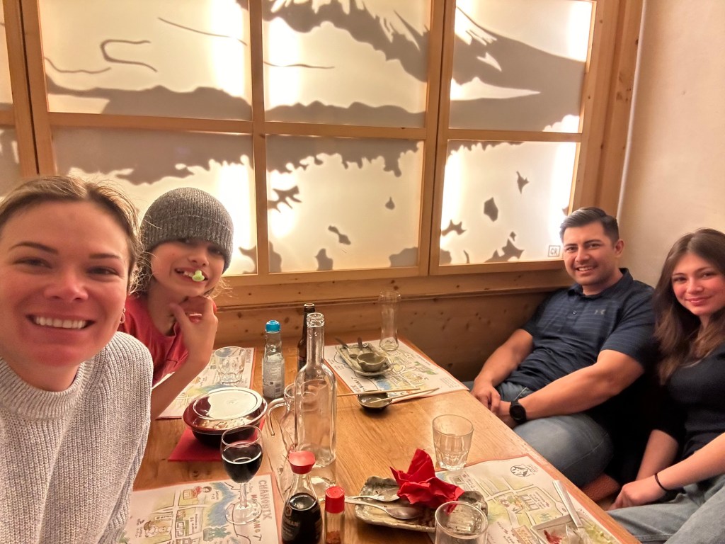 Matt told us that our reservation was for a low table, but he assured us we would not be sitting on the floor. I’m sure you can anticipate what happened next; we were seated on cushions on the floor at the table! Just what you want after a weekend of skiing and with achy knees! 🤣 It was so funny! The food was amazing and we all had fun, although I think we were laughing a little too much for the French patrons at the next table. 😉