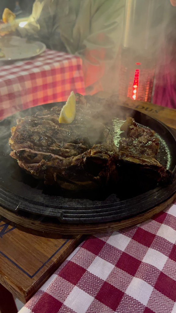 There, we picked a restaurant on the square and had a dinner of Chianina steak and Chianti to relax after the long drive. Chianina beef is native to Tuscany and cut “three fingers thick” and served rare. Ours came on a cooking stone so we were able to cook it slightly more and it was so good.