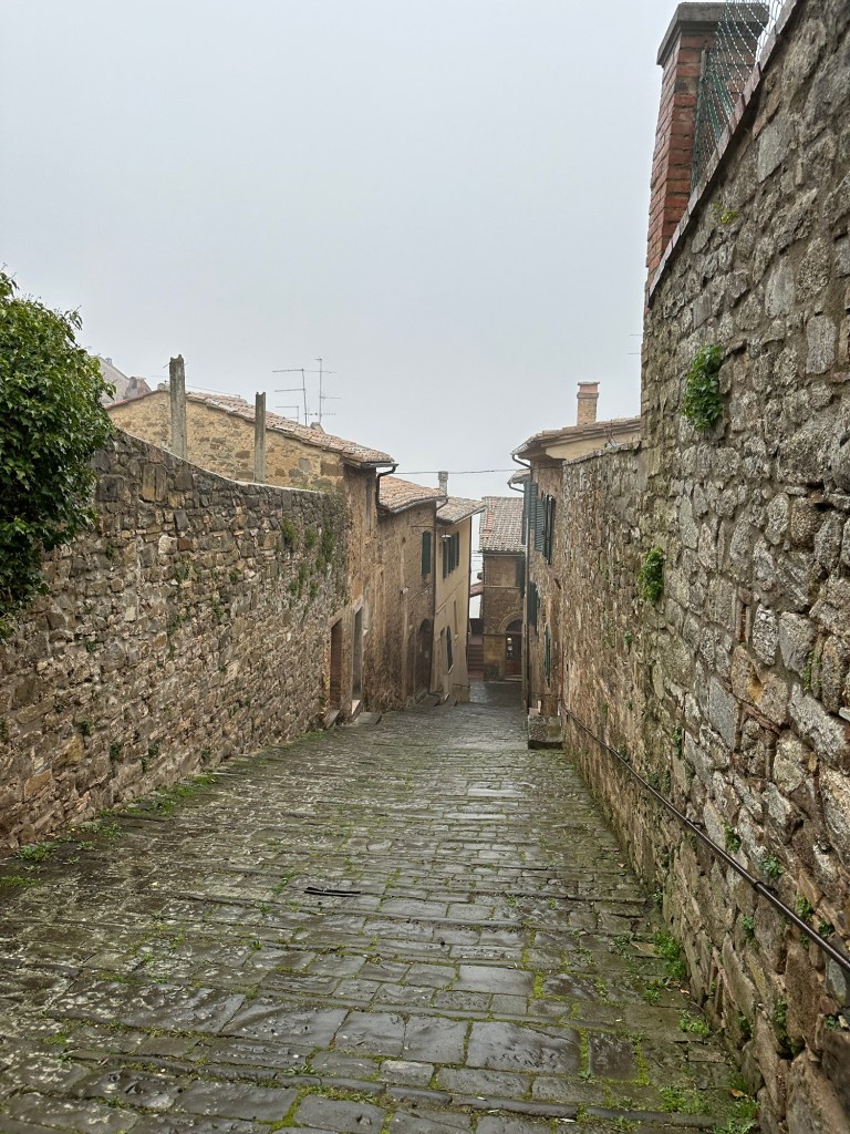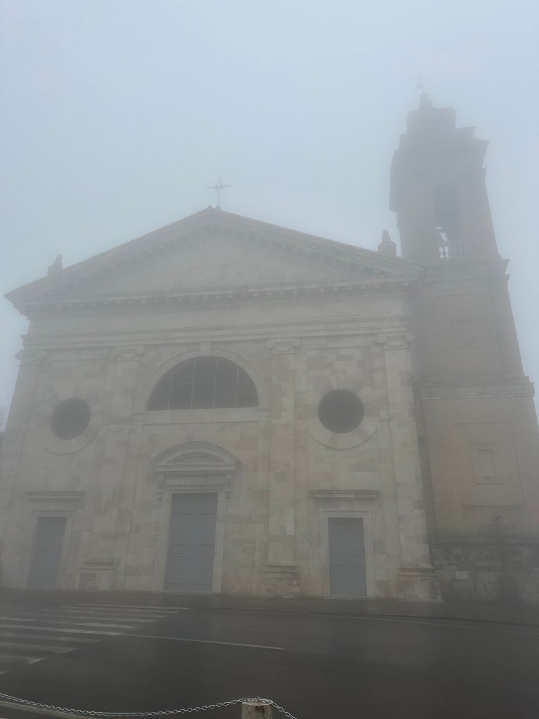 On Wednesday, we woke up to pouring rain. We set out anyways on our day into southern Tuscany, which is known for its wine. We started in Montalcino, known for its Brunello wine. It’s another hilltop village but unfortunately, it was shrouded in clouds when we arrived. The parking lot was at the highest point in town; we parked and started walking down towards the center. It turns out the steep stones that make up the streets are very slippery when wet and I slipped and slid right down a patch of sidewalk. Luckily, I was unharmed, except for my ego.
