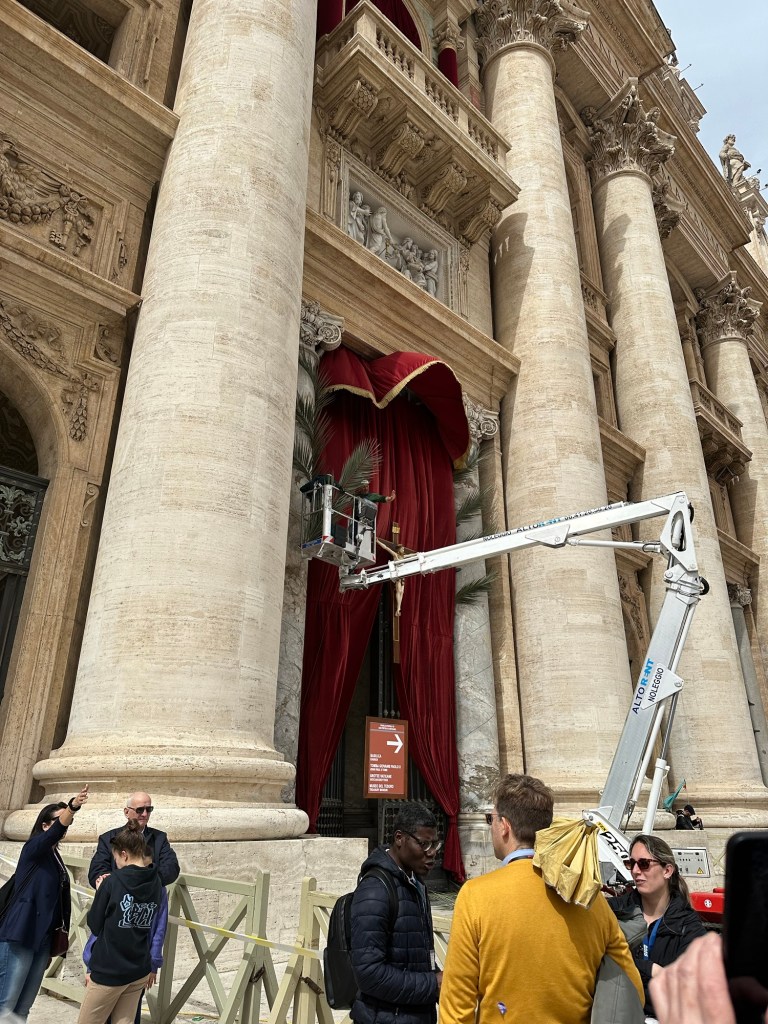 As we walked towards the entrance, we were able to see how St. Peter’s Square was being set up for the Mass. The final palms were being hung around the balcony as we entered.