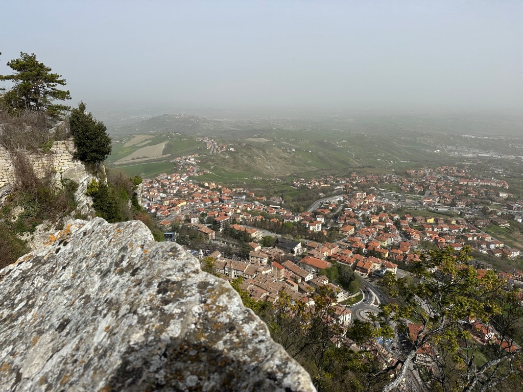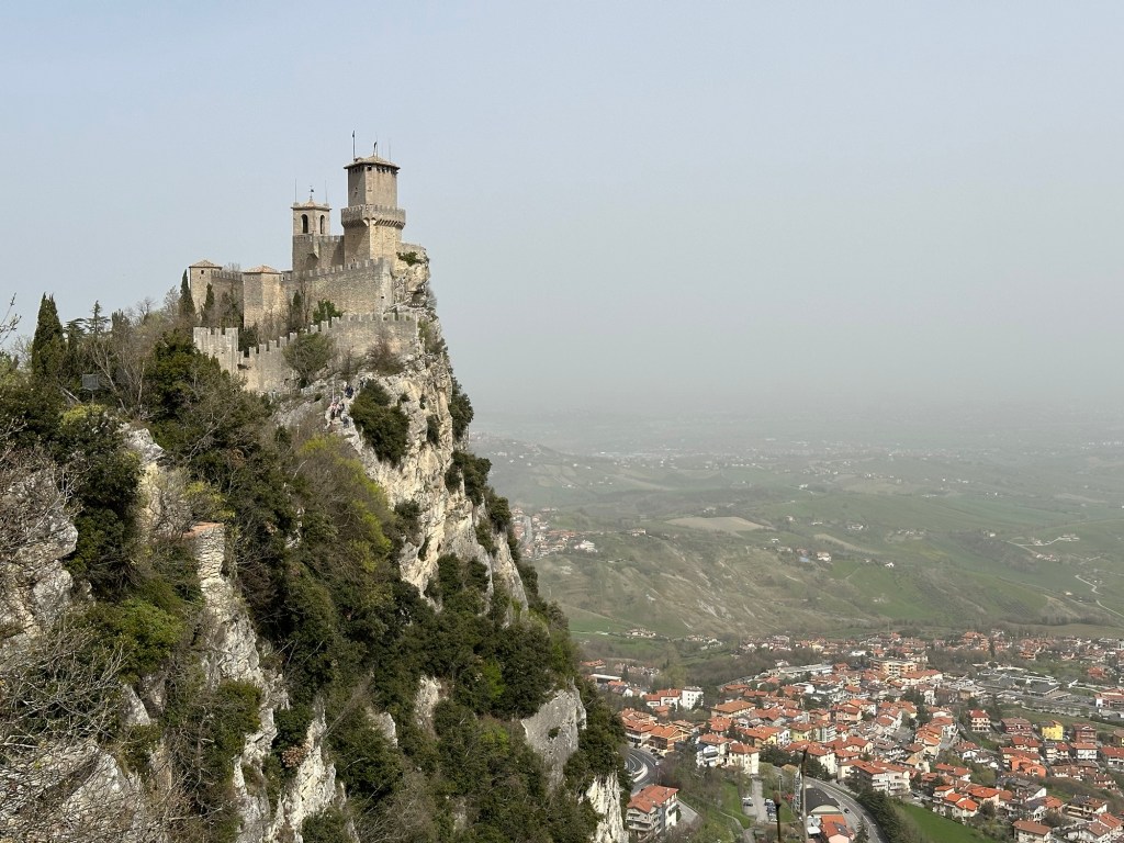 The next morning, it was still pretty hazy. We had breakfast at the hotel and then packed up. We made the drive to the very top of San Marino where its old town and three iconic castles are located. We walked around the town center, taking pictures and doing some shopping. We did try to check out the views from the terraces but sadly, we could not see very far due to the dusty haze.