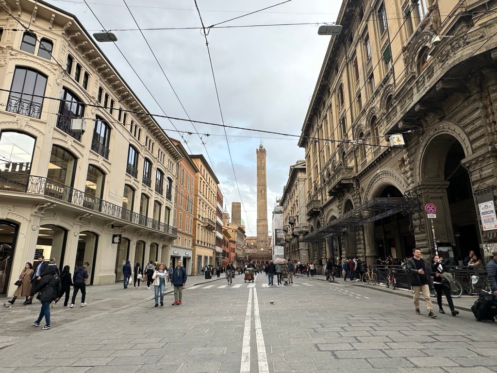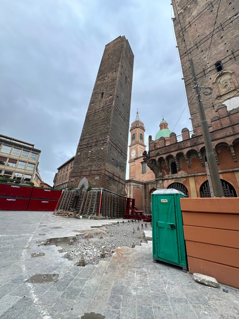 A quick Google research revealed that the one tower, The Garisenda, is now leaning further than the Leaning Tower in Pisa is, and is continuing to lean further and further at a rapid rate. You can see in the picture, some sides have been blocked off with shipping containers. This is to try and protect surrounding buildings as the tower could fall at any time.