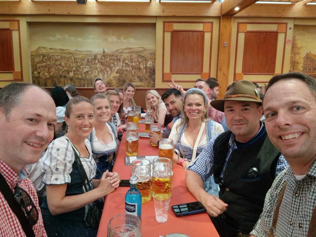 Once we were back from sports, Matt and I quickly got ourselves ready for Stuttgart’s Frühlingsfest and then headed to the train. We made it to our 5:30 reservation at the Grandl’s tent just in time. We had two tables and the twenty of us enjoyed the chicken, bier, and the Schlager band until late into the evening!